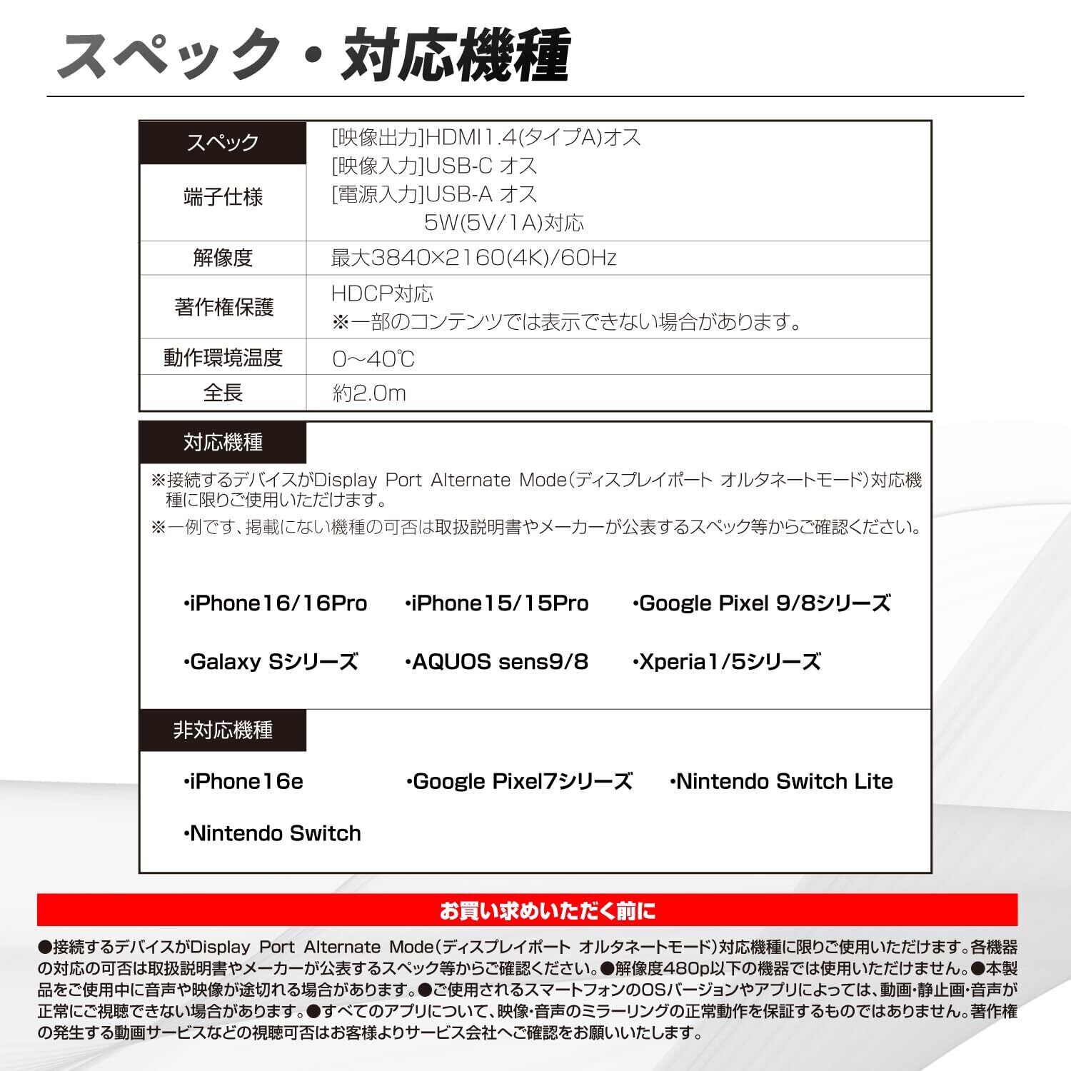 このケーブルは、視聴中に充電が可能な設計になっています。長時間の使用でも安心してお楽しみいただけるので、外出先でのエンターテインメントやビジネスプレゼンテーションにもピッタリです。