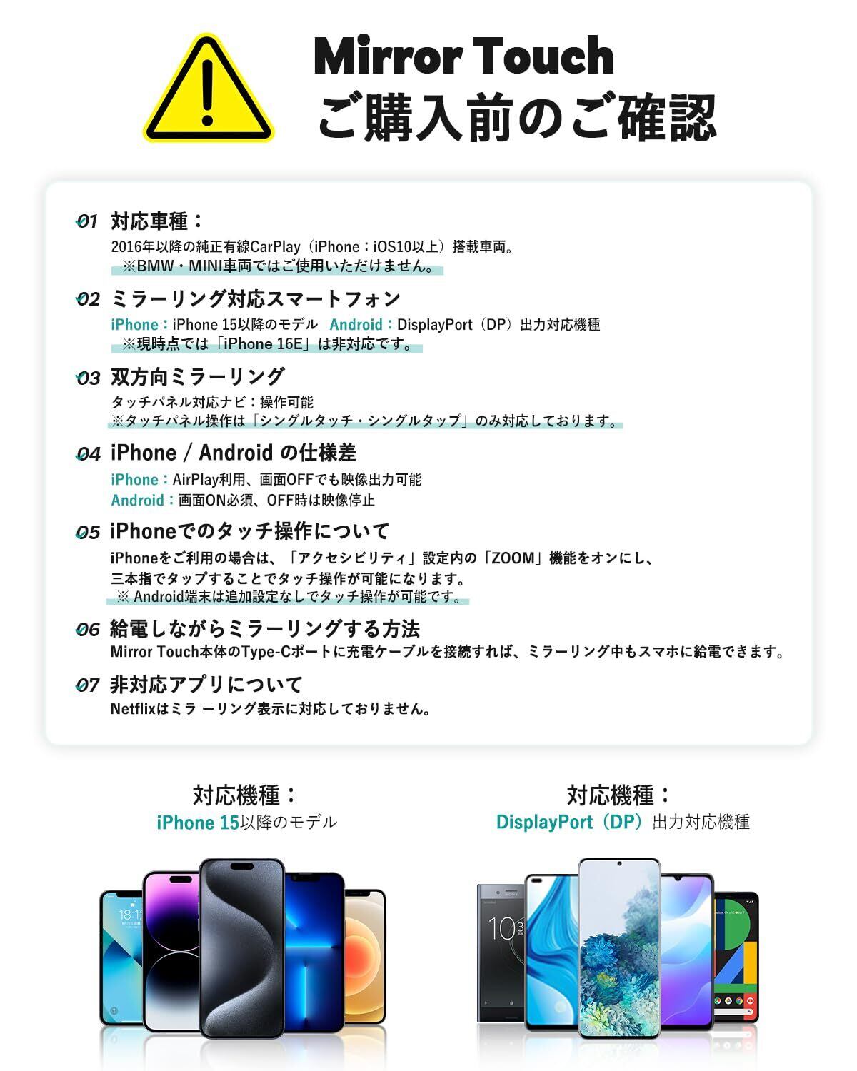 (2025年7月19日時点)①「iPhone 16E」は非対応です。②アルファード40系およびVOLVO XC40(2019年式)では、以前タッチ位置ずれの報告がありましたが、アップデートにより解消済みです。⇒ 同様の症状がある場合は、ファームウェアを最新に更新してください。