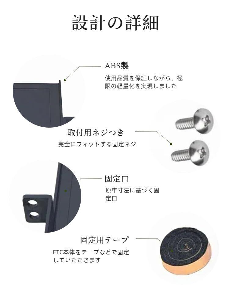 このETC取付基台は、車内をすっきりと整理し、余計なスペースを取らずにETCを美しく固定します。機能性だけでなく、インテリアの一部としても満足いただけるデザインです。