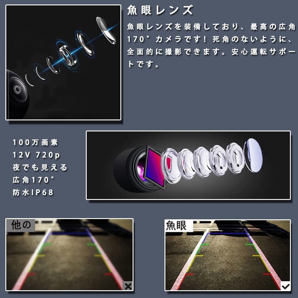 【無光可視&画面明瞭】新高感度CMOSセンサーを搭載!従来のカメラより鮮明な画像を提供い たします。超暗視機能付き、真っ暗の夜間でも車をバックさせている時に車の後ろの状況がはっきり見えます!赤外線フィルイン機能のカメラより圧倒的なメリットがあります。 安心運転サポートの車載用バックカメラです。【魚眼レンズデザイン&高広角170°】魚眼レンズを装備しており、最高の広角170°カメラです!死角のないように、全面的に撮影できます。安心運転サポートです。
