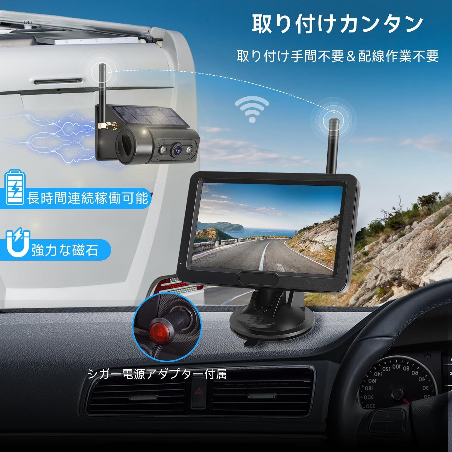 【バックモニターカメラ完全無線】バックカメラ電源の確保は内蔵されたバッッテリーからのため、通常のトラックカメラで必要な車両と配線をつなぐ作業は不要です。モニターに関しては付属したシガー電源アダプターで電力を供給することが可能となり、取付工事などは一切不要です。誰でも1分で取り付け完了です。