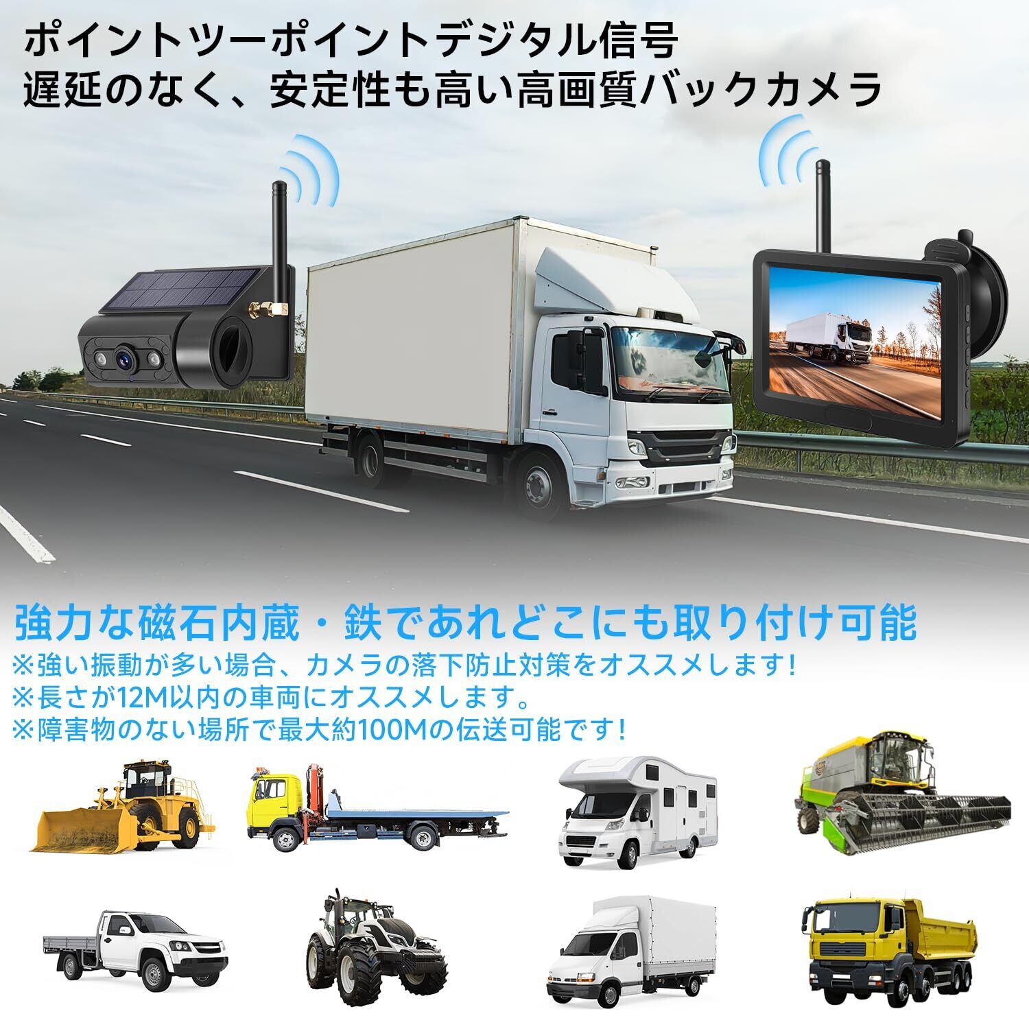 【ワイヤレスバックカメラ】バックカメラモニターは1対1のデジタル信号を使用してるので、混線による心配もありません。また障害物のない場所で最大約100mの広範囲の性能により、トラックやトレーラーなどであっても問題なく使用することが可能です。