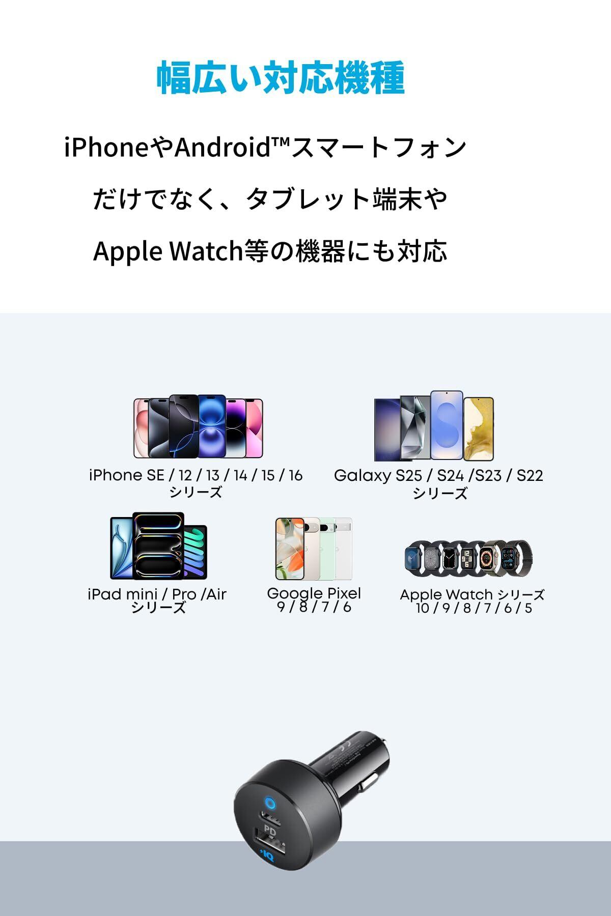 iPhone 16シリーズを含む、さまざまな機種に対応可能です。Androidデバイスもバッチリ充電できるので、家族や友人とドライブを楽しみながら、充電が必要なデバイスを同時に供給することができます。
