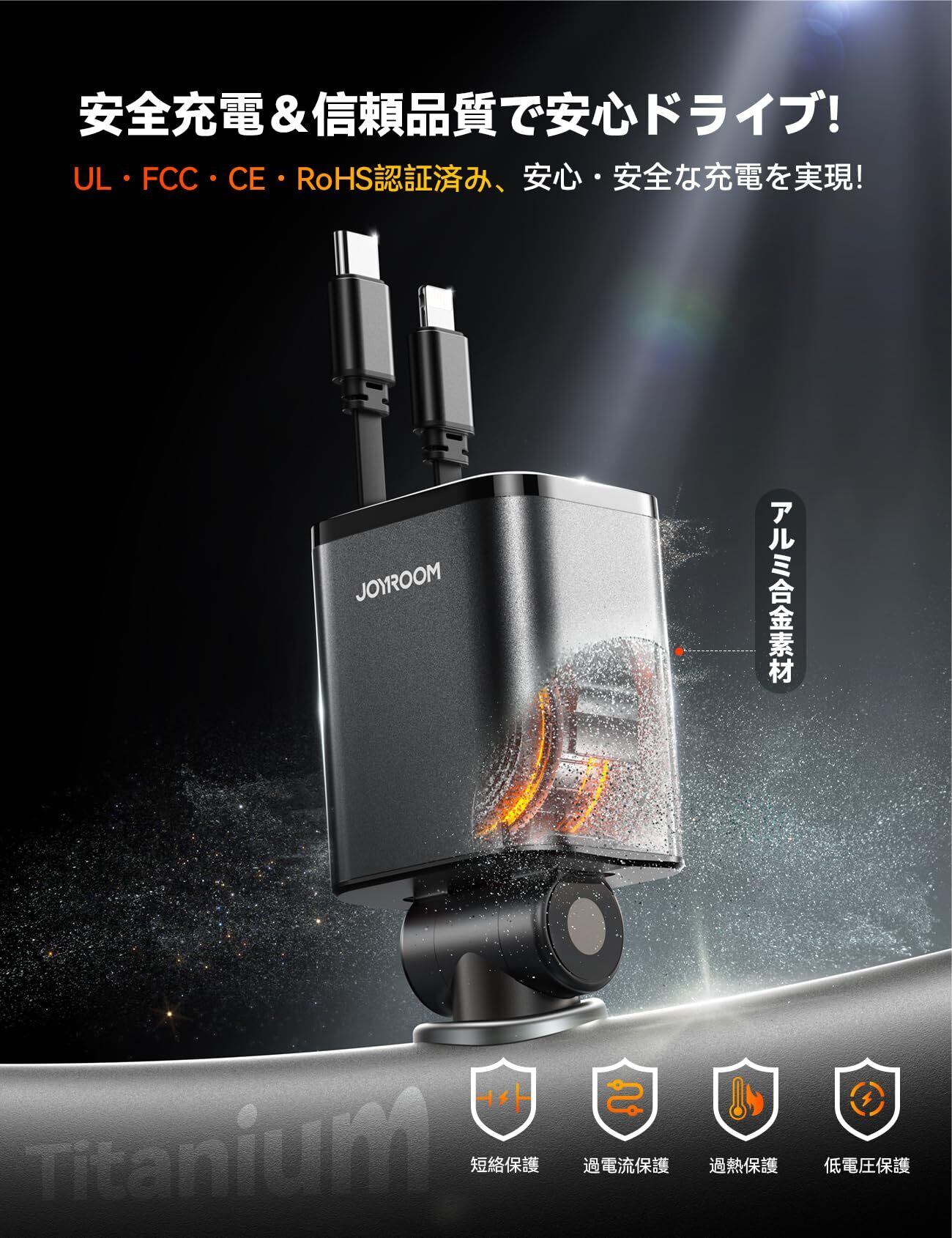 【高耐久&多重保護設計|安全性も抜群】 アルミ合金&難燃性ABS素材を採用し、車内の過酷な環境に対応した設計します。短絡保護、過熱保護、過電圧保護、過充電保護など多重保護機能を搭載し、長時間の使用でも安心します。巻き取り式充電ケーブルは10,000回以上の伸縮テストをクリアし、高耐久で長持ちします。カーチャージャー タイプcをお探しの方にもおすすめのモデルです。