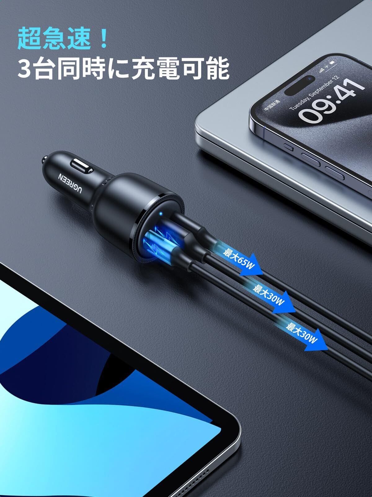 UGREEN【75W 3ポート】 シガーソケット USB C カーチャージャー PD3.0/QC3.0/PPS対応 急速充電 車載充電器 iPhone16/15/14/13シリーズ/iPad/MackBook/Pixel/Galaxy S25シリーズ等に対応