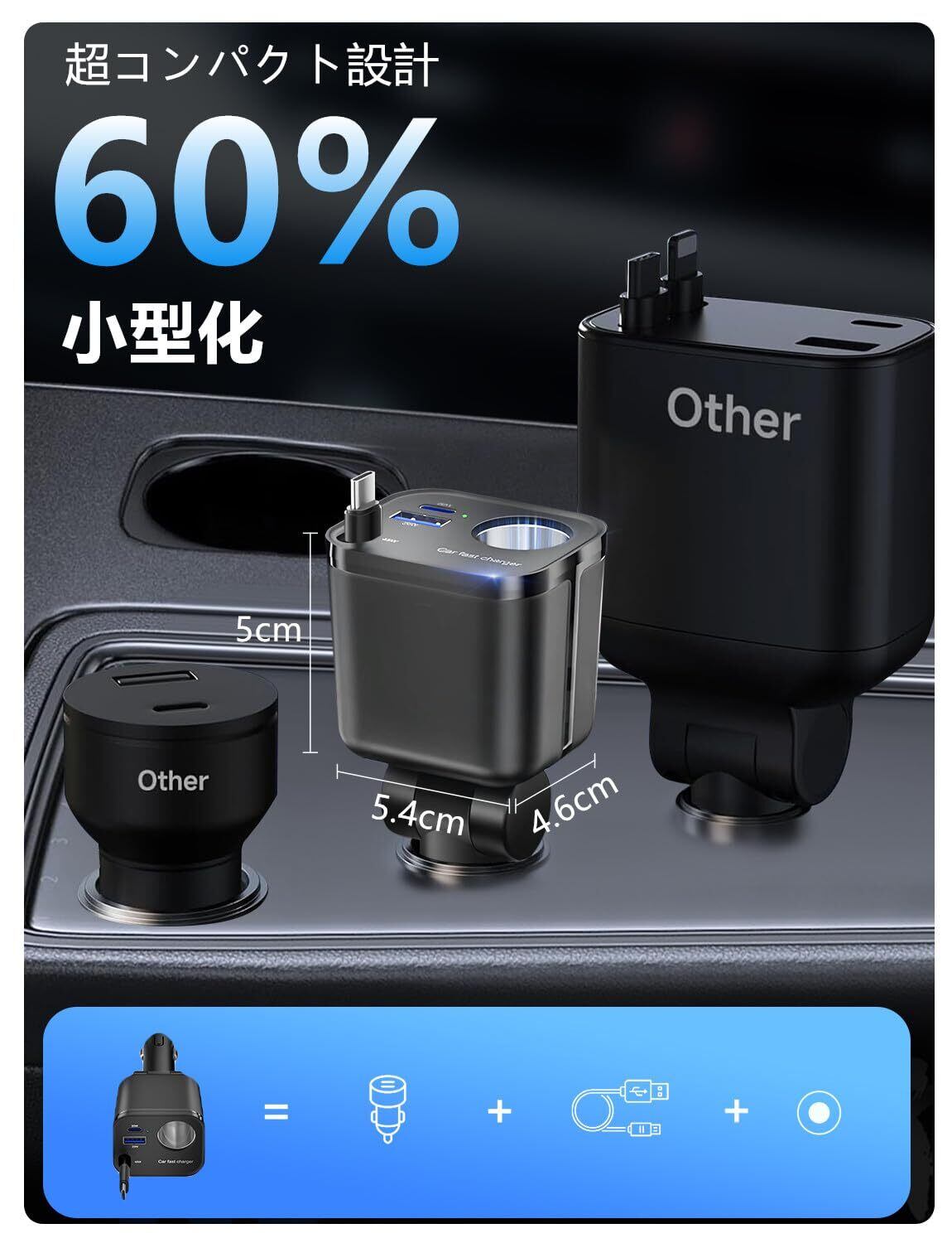 【2025極小型 ● 1秒で収縮!】このシガーソケットは革新的な一体型ケーブル設計を採用し、最長65cmまで伸縮可能です。巻き取り式設計によりケーブルの絡まりや散らかりを防ぎ、車内を清潔で整然とした状態に保ちます。サイズは約4.6cm×5.4cm×13.7cmで、車のインテリアに完璧に調和します。幅4.6cm、最大挿入深さ8.7cmのシガーソケットに対応しています。従来の車載充電器と比べて体積を60%も縮小し、スペース利用率が大幅に向上。さらに、180度調整可能な角度で、ドライバーは自分の好みの角度に自由に調整可能で、運転操作を妨げることなく、快適な使用感を実現します。このカー用品で、ワイヤレスの新しい生活様式を体験しましょう。