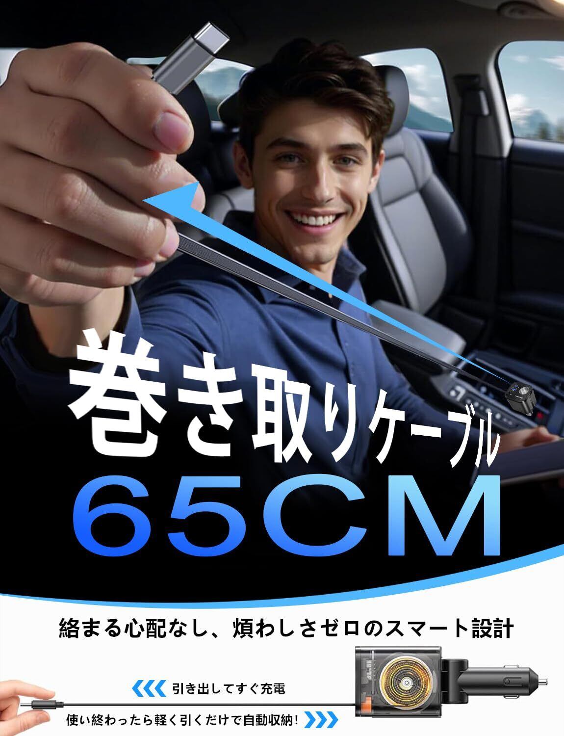 巻き取り式のケーブルデザインで、使わないときはスッキリ収納。車内が散らかる心配もなく、すっきりとした空間を保てます。旅行や出張にも最適です!