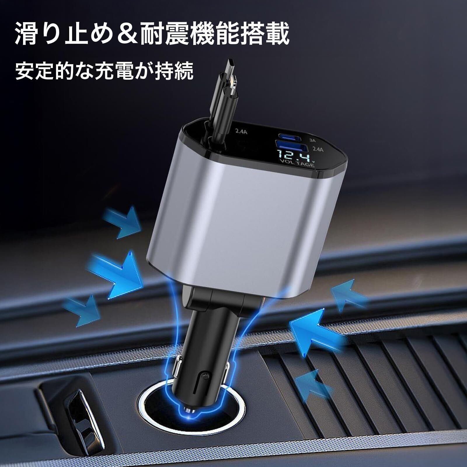 【同時に4台のデバイスを充電可能】 ・同時4台充電が可能のしがーソケット型車載充電器。 ・2本の巻取り式ケーブルと2つのUSBポートを搭載。 ・ブルーLED電圧計で車のバッテリー電圧をリアルタイムで確認可能。 ・いざというとき、予備の充電、災害などでも安心。安全なドライブをサポート。