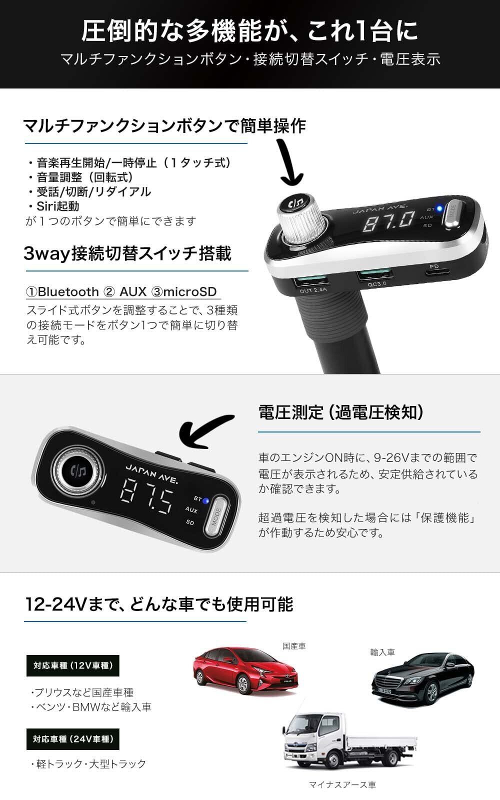 JAPAN AVE.(ジャパンアベニュー) FMトランスミッター Bluetooth 5.0 (最大48W急速充電 / ATSチップ搭載) iPhone QC3.0 + USB PD (Type-C) 搭載/AUX-IN&OUT 有線接続 / 12-24V シガーソケット SmartBC アプリ 無償提供 JA999