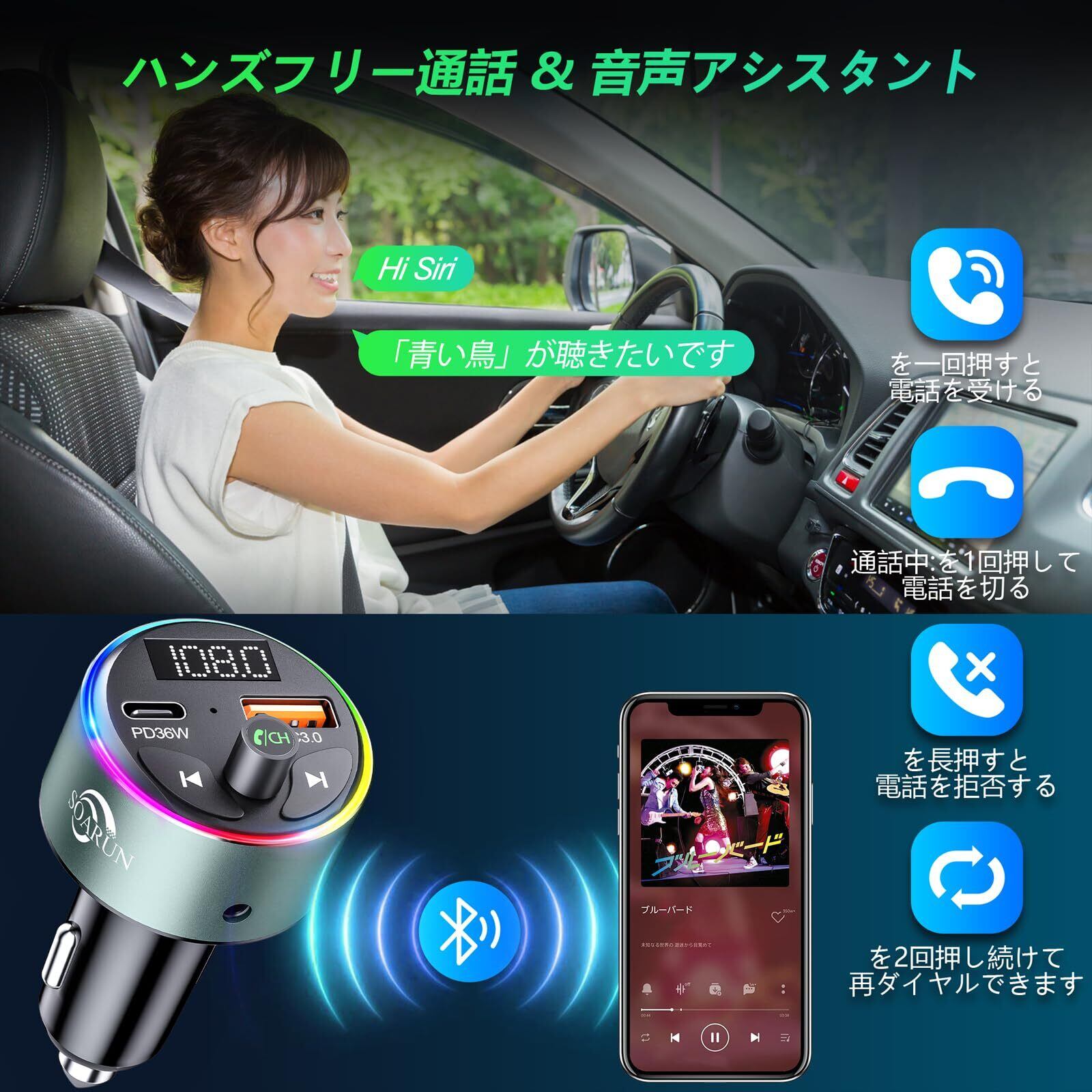◆【2025人気ア最新型】SOARUN FMトランスミッター Bluetooth 5.3 車載充電器 PD36W+QC3.0 急速充電 2ポート FMカーチャージャー Siri&Google Assistant対応 ハンズフリー通話 9RGBバックライト LEDライト シガーライターソケット AUX入力 音楽再生 12V/24V車対応