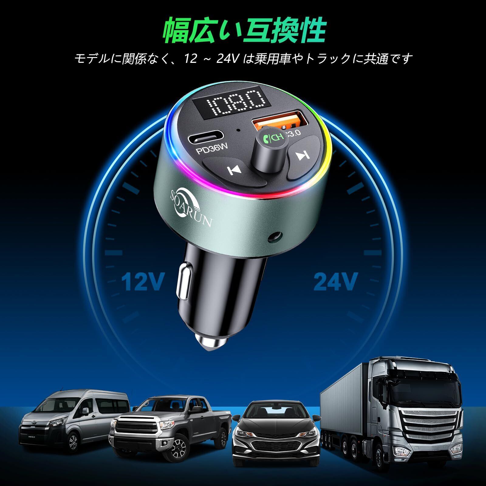 このFMトランスミッターは12Vから24Vの車両に対応しており、普通車からトラックまで様々な車種で安心してご利用いただけます。また、多様なBluetoothデバイスと互換性があります。