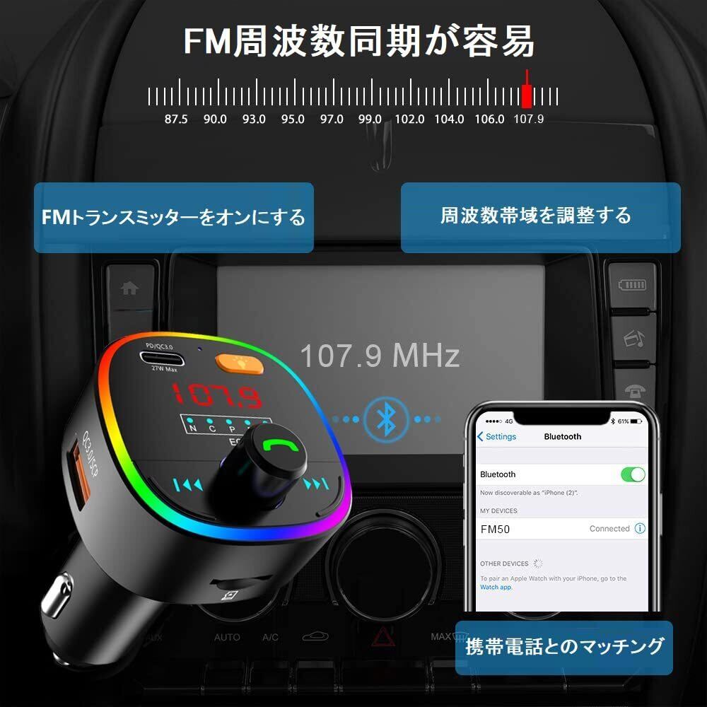 【10色LEDライト&幅広い互換性】この FM トランスミッターは柔らかい10色変換可能LEDライトが搭載され、12V~24V車対応の入力、周波数87.5-108Mhz。