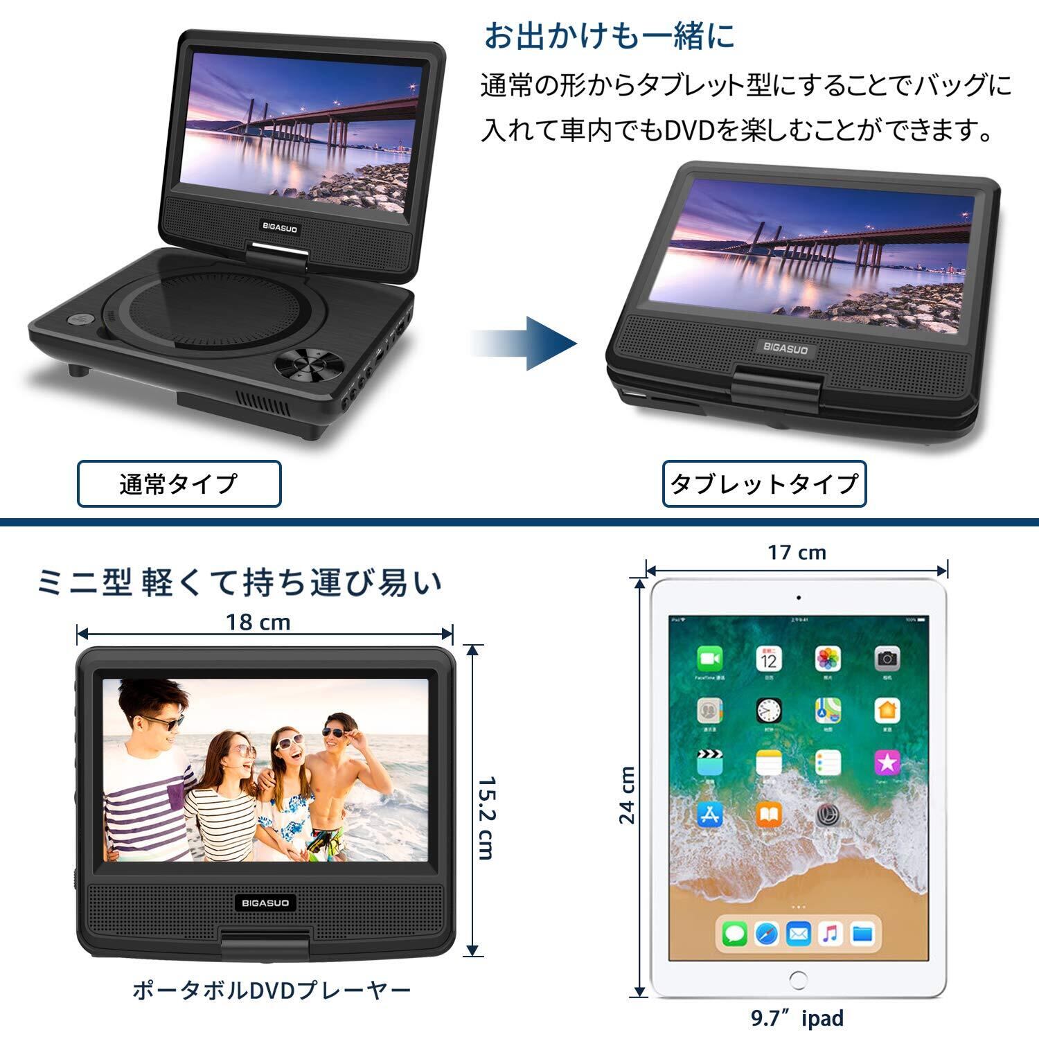 BIGASUO ポータブルDVDプレーヤー 7.5インチ 単3形乾電池式 6時間再生可能 リージョンフリー 車載 270度回転 AC DC 3電源対応 CPRM/USB/AVに対応 適格請求書発行可