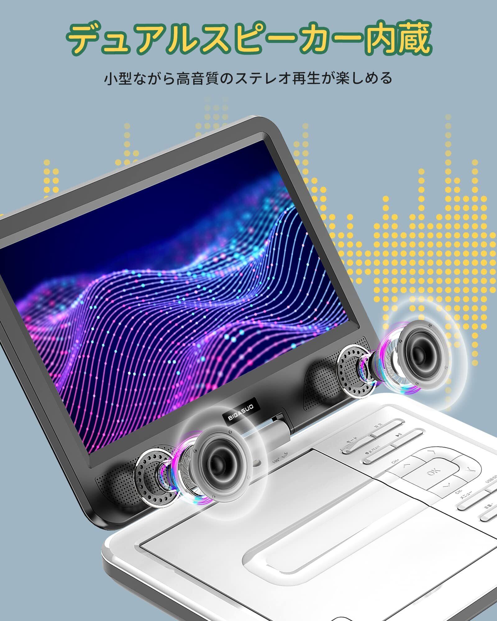 BIGASUOのポータブルDVDプレーヤーは、明瞭な1024*600液晶を搭載しており、映画やテレビ番組を外出先でも鮮やかに楽しむことができます。270°回転する機能で、置き方を選ばず、どんな体勢でも快適に視聴可能です。