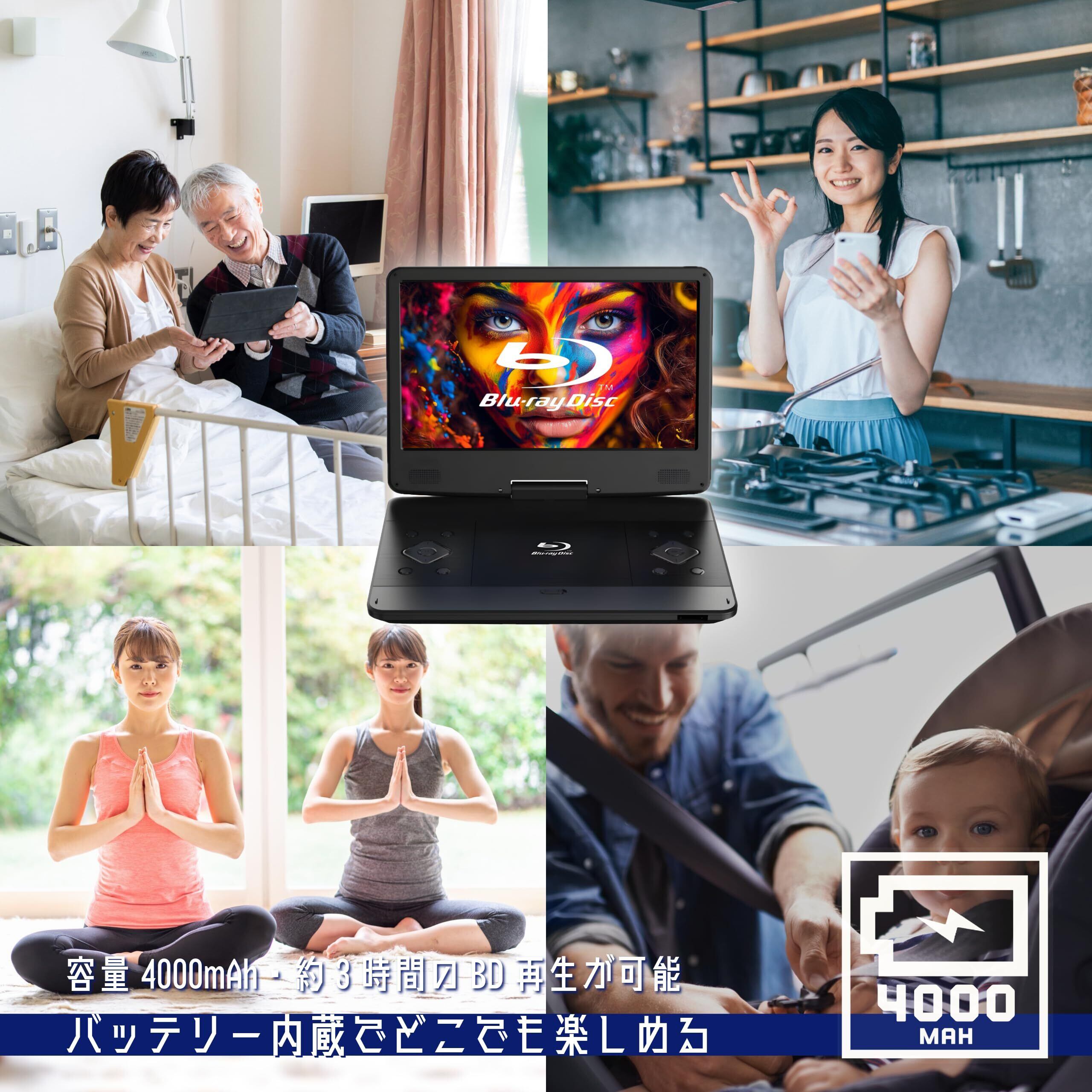 AC DC 充電バッテリーの3電源で使用可能。いつでもどこでもBlu-ray、TVが楽しめる。