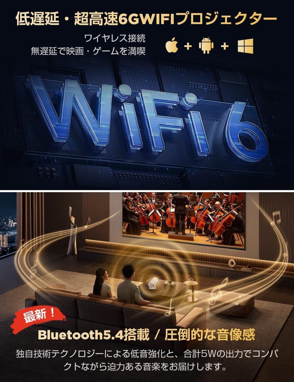 【超高速Wi-Fi 6&Bluetooth5.4&高音質HiFiスピーカー】独自開発された高精度チップ技術を使用してある本小型プロジェクターは、2.4G+5Gの周波数帯を同時利用でき、安定した信号と高い伝送速度を備えた超高速 6G WiFi 接続テクノロジーも備えています。 iOS、Android、Windows デバイス (ミラーリング対応のスマートフォン、タブレット、コンピューターなど) を Wi-Fi 経由ですばやく接続し、非常にスムーズで遅延のないオンライン ゲーム、映画鑑賞、ビデオ体験を簡単に楽しめます。また、Bluetooth 5.4 と高品質 HiFi スピーカーが内蔵しており、お気に入りのスピーカー、DVDプレーヤーやワイヤレス ヘッドフォンからオーディオをストリーミングすることができ、臨場感あふれる立体的なサウンドで圧倒的な没入感を味わえ、自分ための空間づくりにします。(ご注意:一部のBluetoothスピーカーとの互換性はありません。)