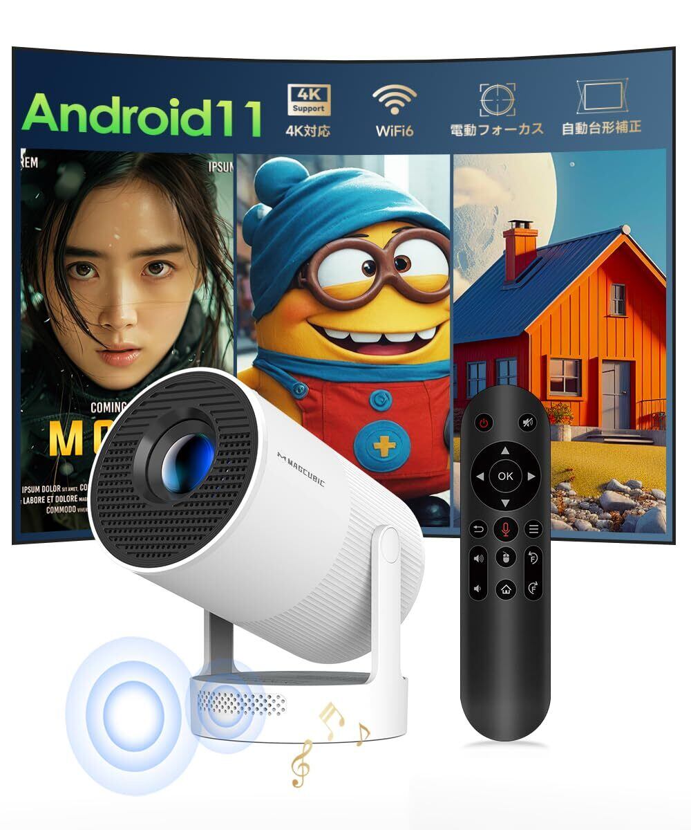 プロジェクター 家庭用【電動フォーカス・HiFiスピーカー】Magcubicプロジェクター 小型 Android TV搭載 180°回転 天井投影 20000LM ぷろじえくたー 4K対応 Wi-Fi6 Bluetooth5.4 自動台形補正 ズーム機能 短距離投影 一人暮らし ホームプロジェクター スマホ/タブレット/ラップトップ/TV Stick/USBドライブ/PS機など対応(白)