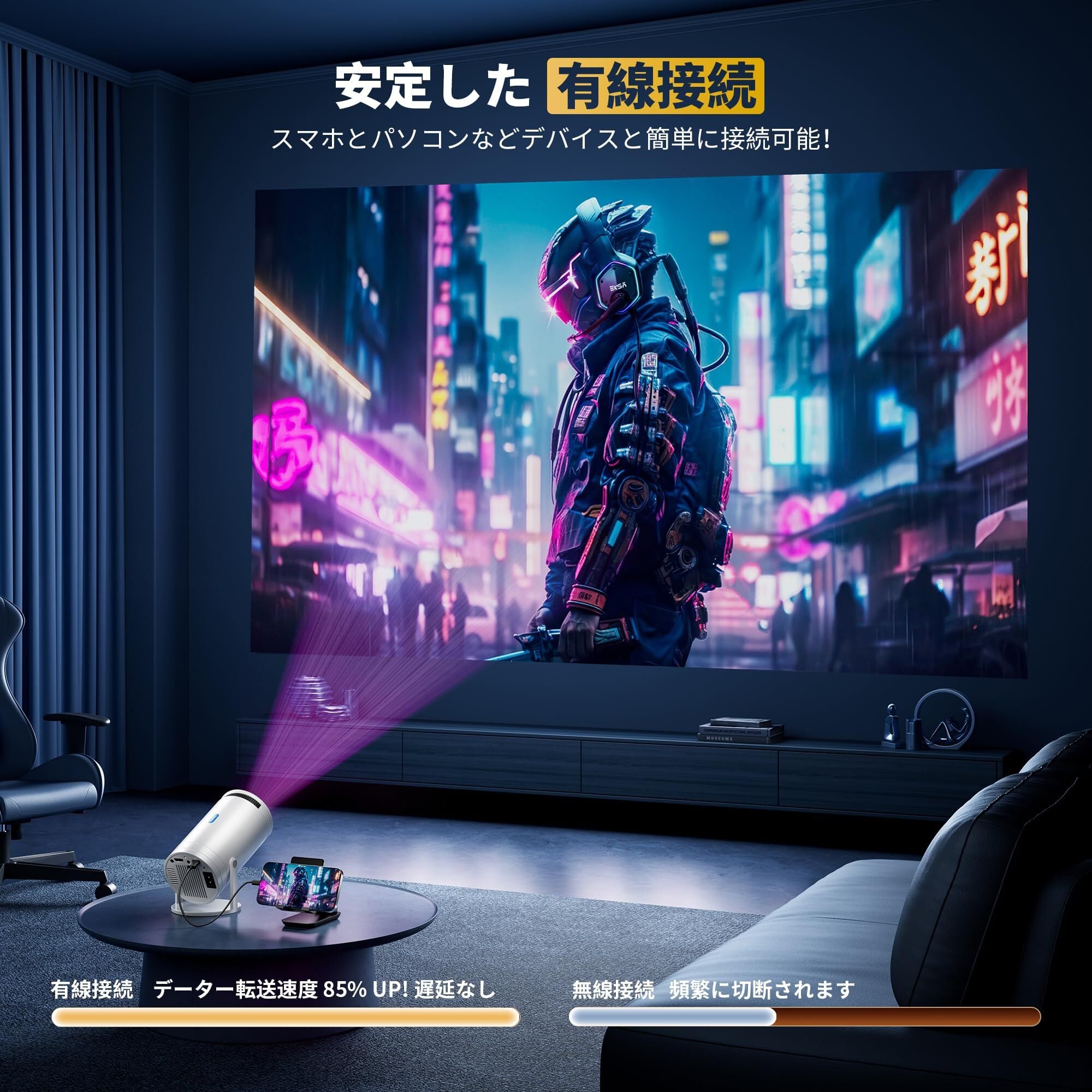 【Android&IOS有線接続プロジェクター】家庭用プロジェクターはAndroid&IOS有線接続に対応しています。ただ一本の純正な充電ケーブルでスマホとプロジェクター 4Kを接続して、スマホの画面を簡単に共有できます。WiFiネットワークがない環境でもお好きな動画を楽しめます。無線接続と比べて、プロジェクター 天井投影可の有線接続技術はケーブルを経由してスマホのデーターを直接に小型プロジェクターに転送できて、データー転送の安定性がもっと高い!無線信号の干渉や切断の心配はありません!(❇️❇️❇️ご注意:著作権保護のため、Netflix、Prime Video、Disney+などアプリ動画はスマホからホームプロジェクターに投影できません。HDMI接続でパソコン或いはTV Stickと接続してそちらの動画を鑑賞してお勧めいたします。)