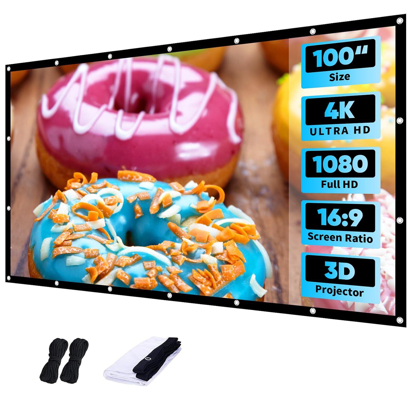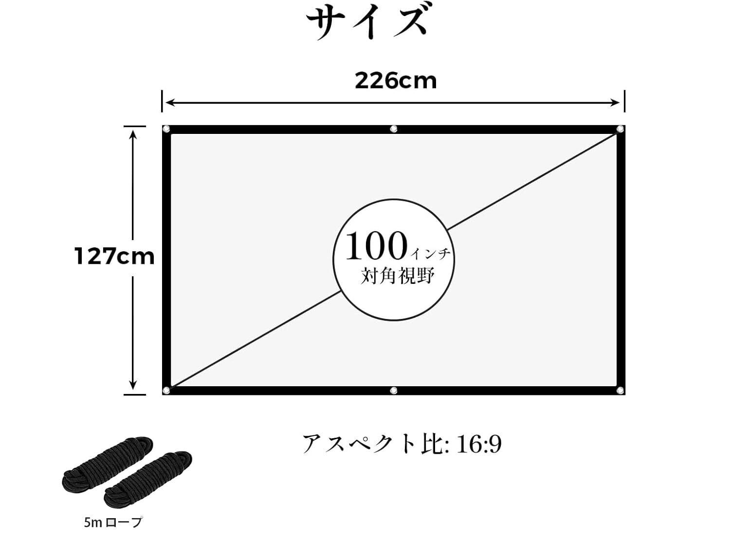 このプロジェクタースクリーンは、100インチのサイズで映画やプレゼンテーションに最適です。アスペクト比16:9により、どのシーンでも美しく映し出され、高画質の映像を楽しめます。4Kおよび1080P FHDに対応しており、臨場感あふれる体験を提供します。