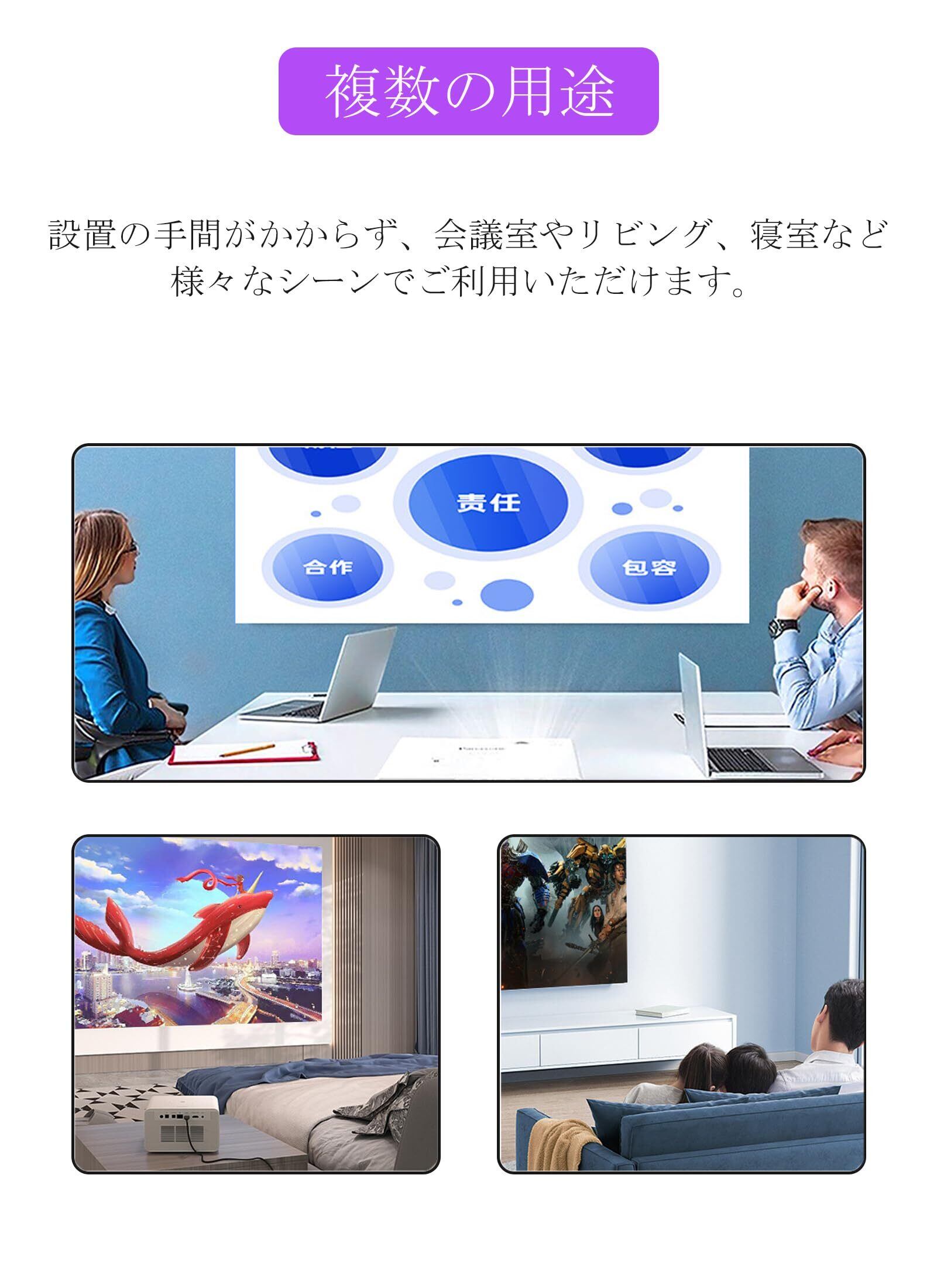 幅広い用途:カーテンはプロジェクターと平行であり、プロジェクターとカーテンの間に 3 つの点と1 つの線がある角度で見ることをお勧め。人がプロジェクターの隣または真後ろにいる場合に最も効果的だ。