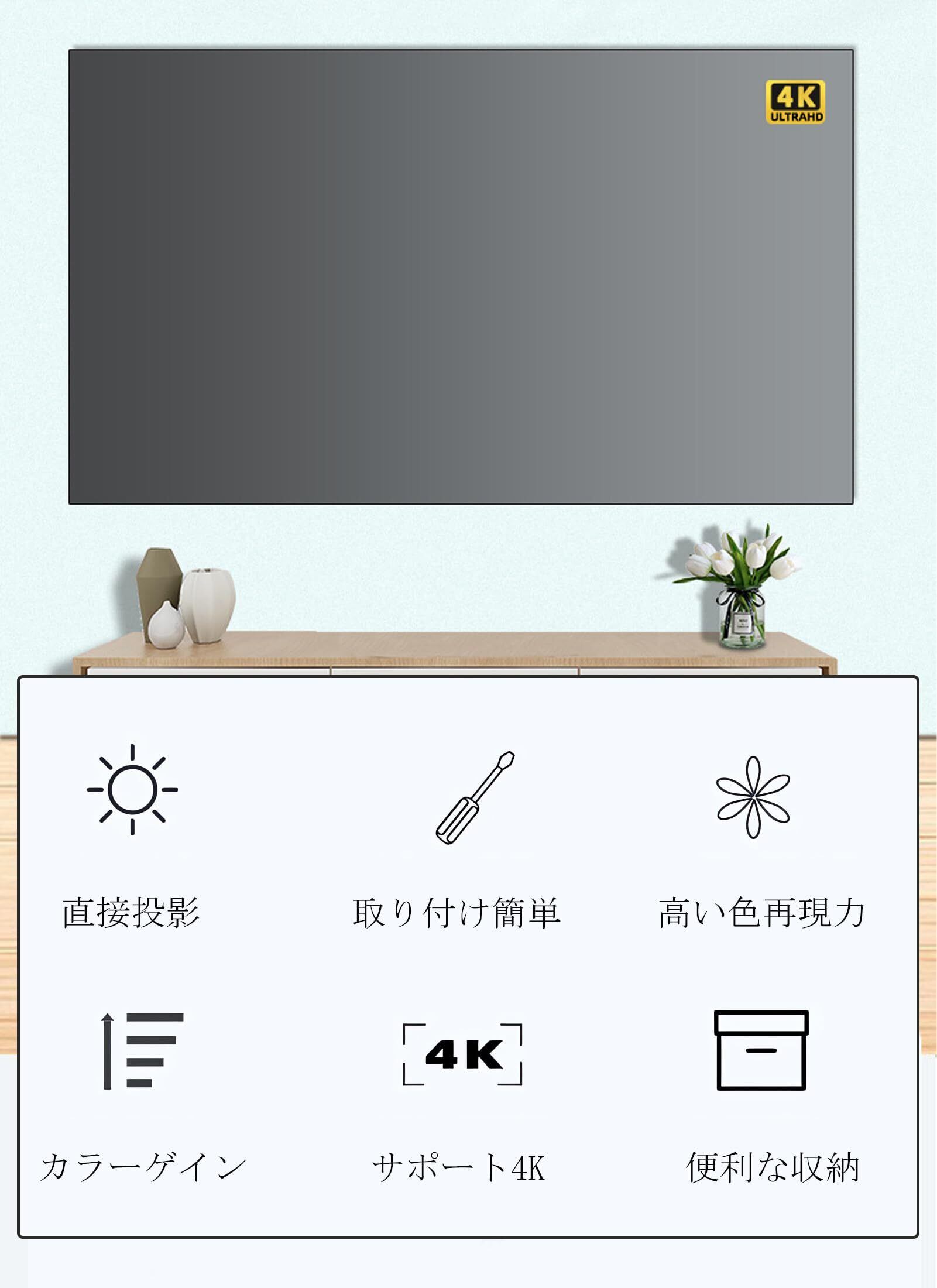 このプロジェクタースクリーンは100インチのサイズを誇り、自宅にいながら映画館さながらの迫力を体感できます。アスペクト比16:9に対応し、4K高精細画質で鮮やかでリアルな映像をお楽しみいただけます。