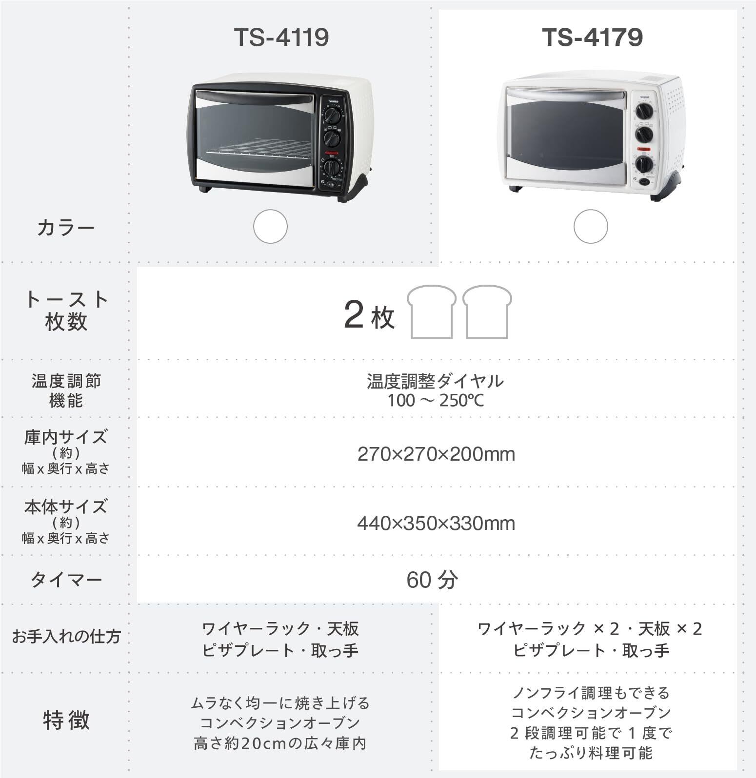 ◆TWINBIRD(ツインバード) コンベクション ノンフライ オーブン トースター 14L 温度調節可能 二段調理 フードドライ レシピブック付 ピザストーン付 ホワイト TS-4179W