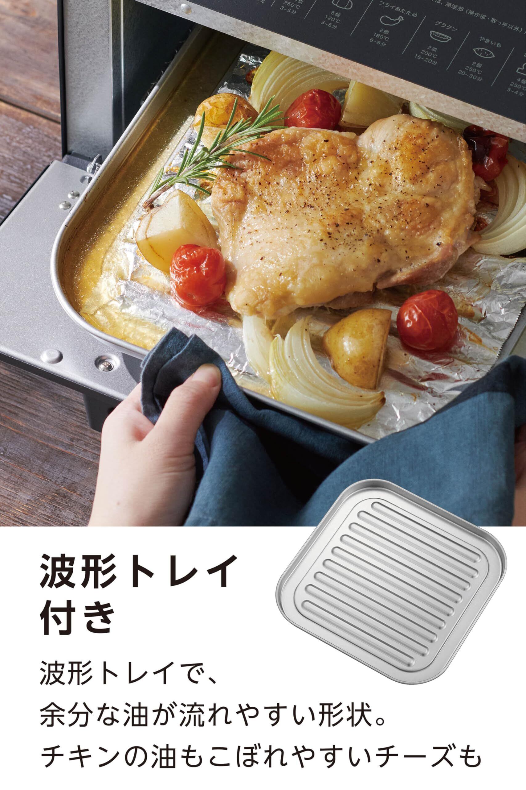 【4本ヒーター&波型トレイ!】庫内には4本のヒーターを搭載!上下に2本のヒーターを設置しており、細かい温度コントロールが可能。焼きムラ低減のメッシュラックが付いているので、仕上がりもキレイ!また波型のトレイが付いており、余分な油が流れやすいので、ローストチキンなど肉料理でもご利用下さい。