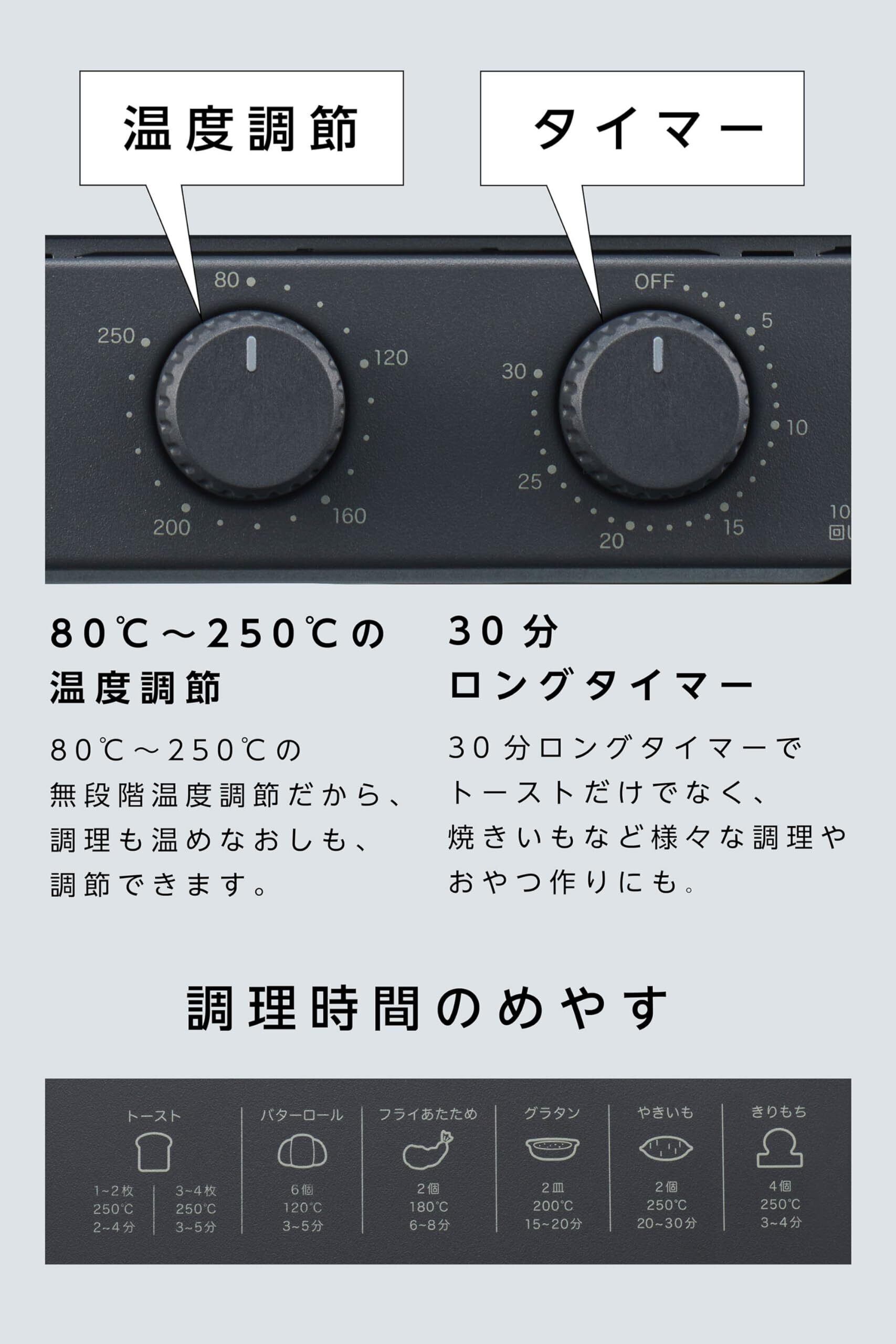 【簡単操作で多彩な料理が楽しめる!】80℃~250℃まで温度設定が可能。トーストや焼き芋はもちろん、温度帯が繊細なお菓子作りまで、多彩な料理に挑戦できます。シンプルなダイヤル操作で料理初心者さんでも使いやすい。