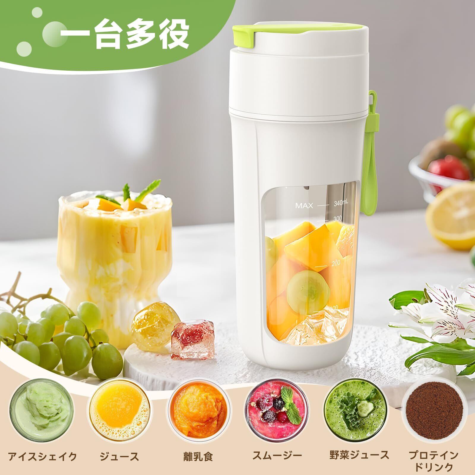 USB Type-C充電式設計のため、アウトドアや旅行、オフィスでも簡単に持ち運べます。340MLのボトルは一人用にぴったりで、使いたいときにサッと作れる便利さも魅力です。