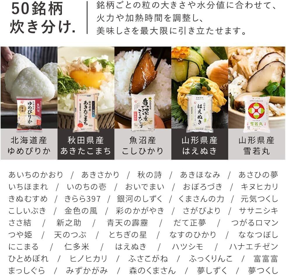 【他にも多彩なモード/コース選択】・家計にやさしい“エコモード”:通常炊飯より少ない消費電力で炊飯するから、エコ&節約。 ・新米を美味しく!“新米モード”:新米のつやとみずみずしさを引き出します。 ・忙しい方にオススメ!“早炊きモード(※)”:吸水時間を省略することで、通常メニューより短時間で炊き上げます。 (※炊きあがり時間は水の量や温度、時期によって変動します。米銘柄、おこのみ炊き分けはできません。)