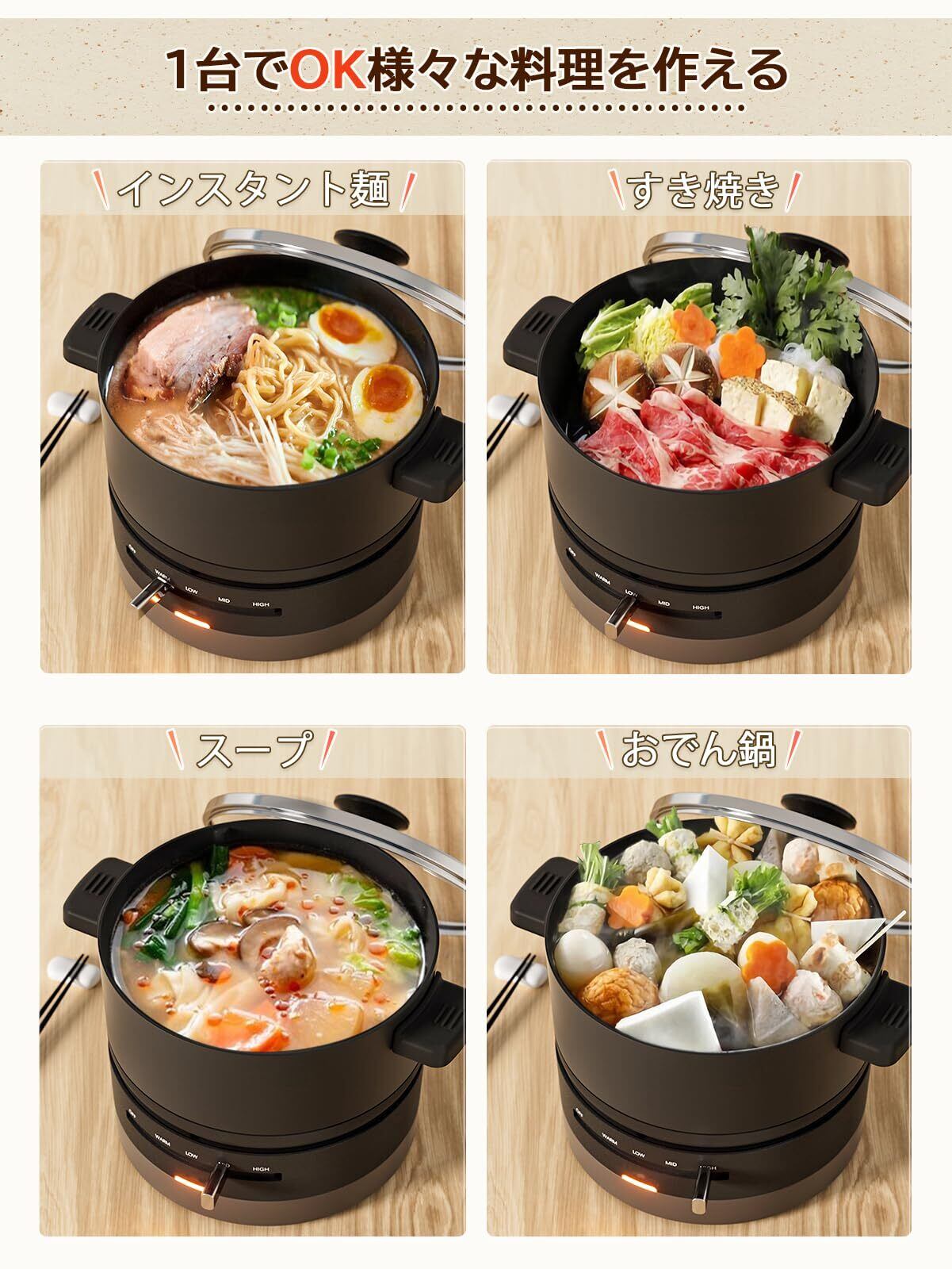 この電気鍋は、煮る・焼く・炒める・温めるができる1台4役の優れものです。自宅での一人鍋や、手軽にラーメンを作るのに最適です。シンプルなブラックカラーはどんなキッチンにもマッチし、スタイリッシュな雰囲気を演出します。