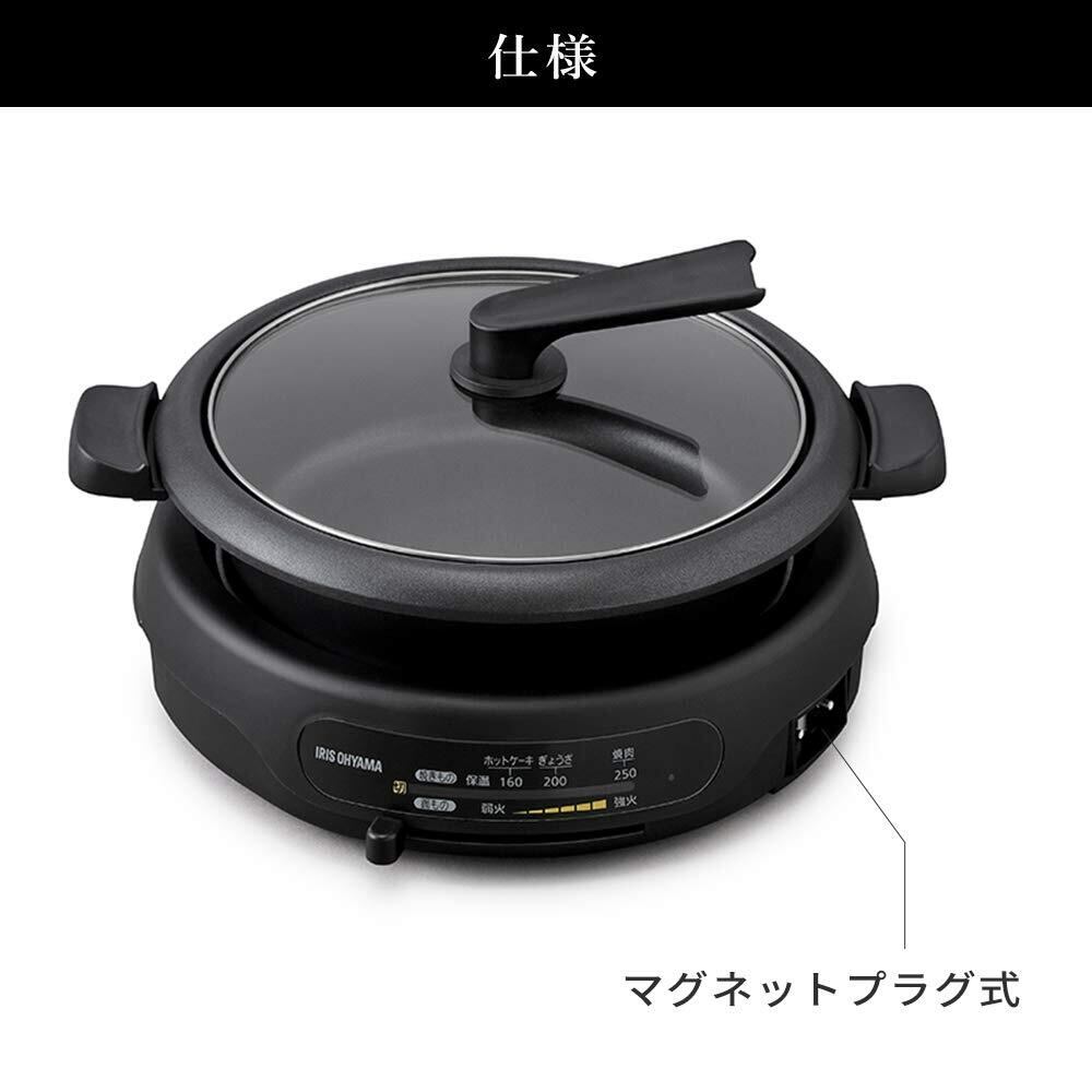 アイリスオーヤマのホットプレートは、1枚の深鍋プレートを備えており、焼肉から煮込み料理、さらにお好み焼きまで幅広く楽しめる優れたアイテムです。シックなブラックのデザインが、どんなキッチンや食卓にもスタイリッシュにマッチします。