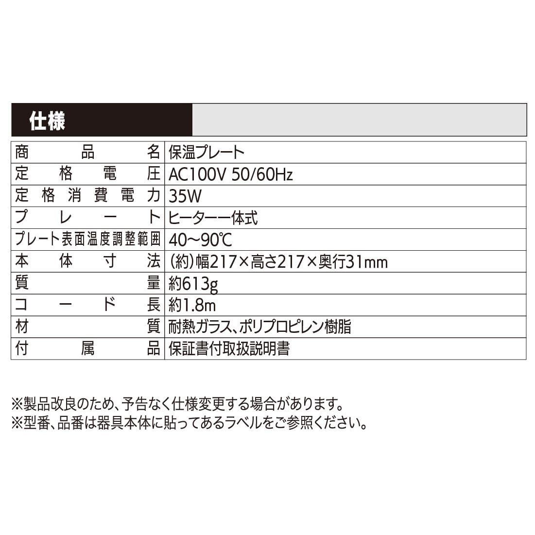 【 仕 様 】 ◆定格電圧:AC100V 50/60Hz ◆定格消費電力:35W ◆プレート:ヒーター一体式 ◆プレート温度調整範囲:40~90℃ ◆本体寸法:(約)幅217×高さ217×奥行31mm