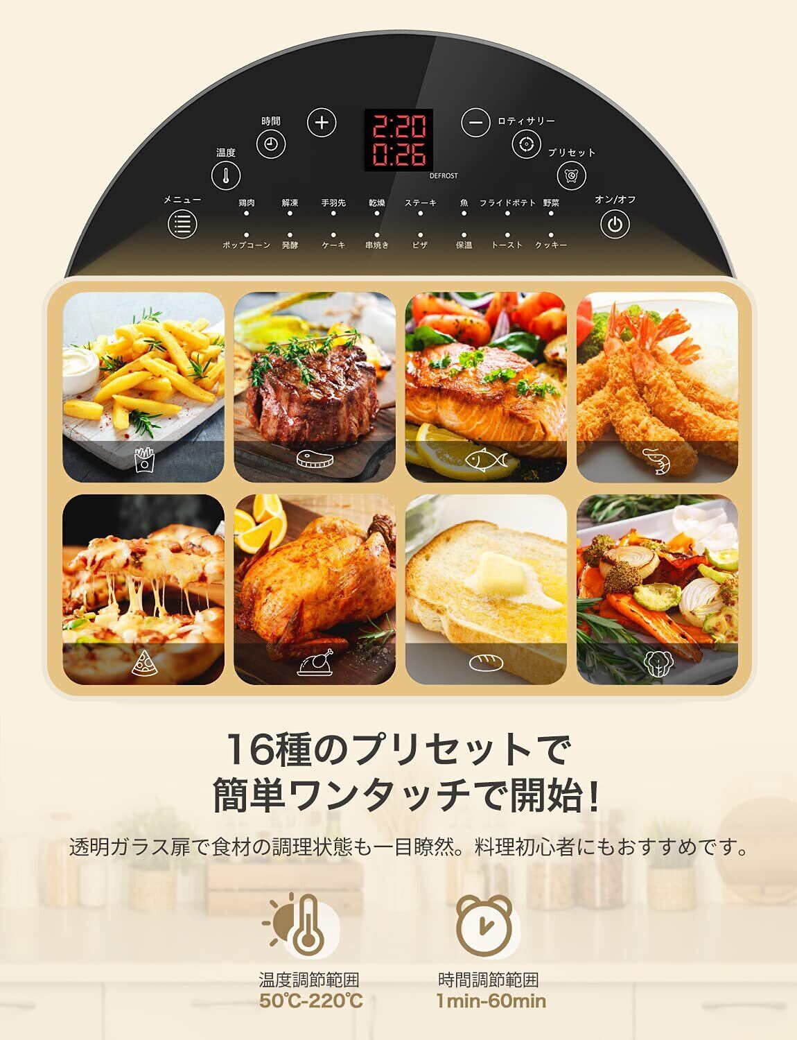 LEDディスプレイを搭載したこのノンフライヤーは、温度や時間を簡単に設定できるので、料理初心者でも安心してお使いいただけます。16種のプリセットメニューが用意されており、煩わしい設定不要で、自動的に最適な調理を行います。
