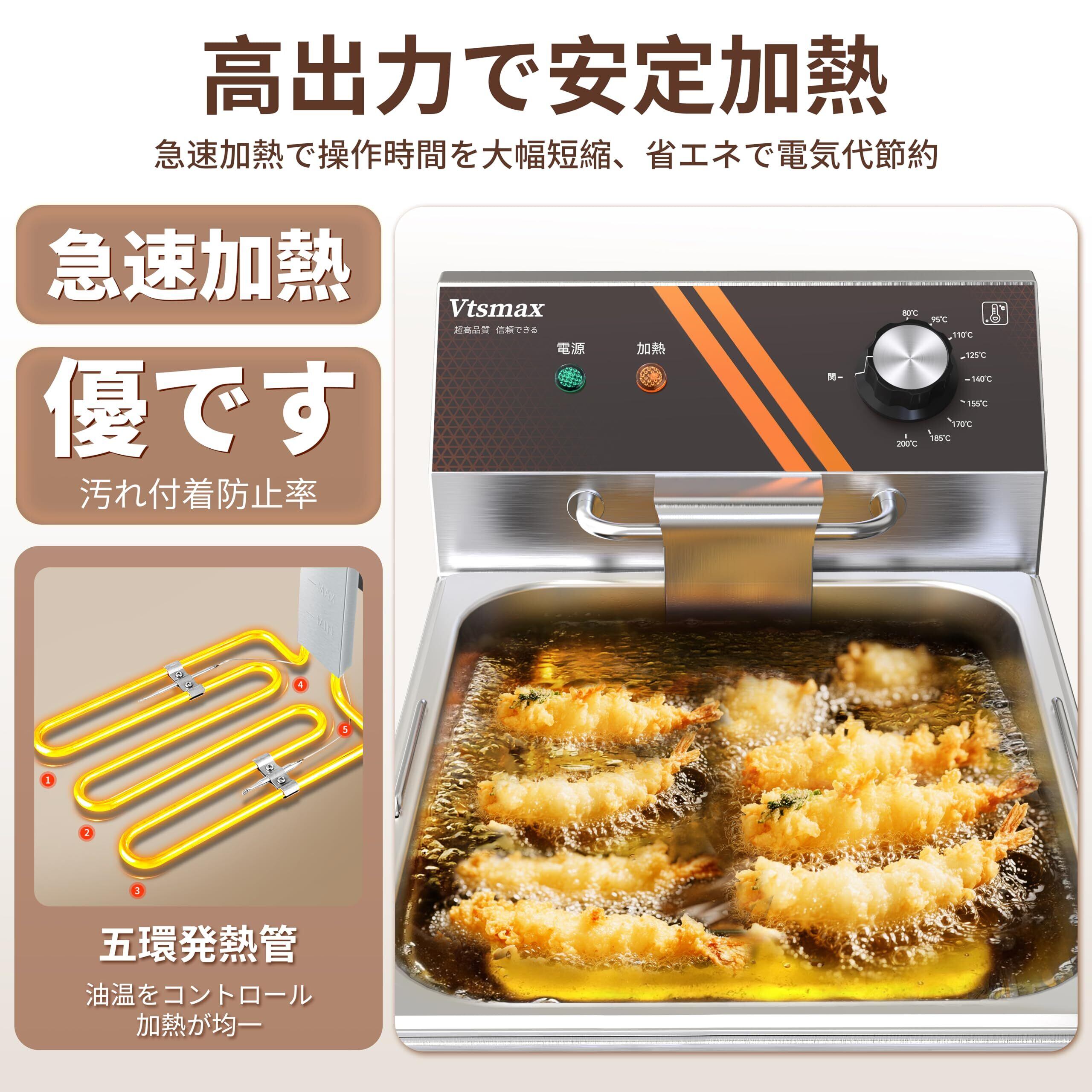 Vtsmax 10L 業務用電気フライヤー 家庭用 1500W 5リング加熱管 急速予熱 50-200℃精密温度制御 304ステンレス 自動保温 フライバスケット付き 天ぷら/から揚げ/フライに 100V
