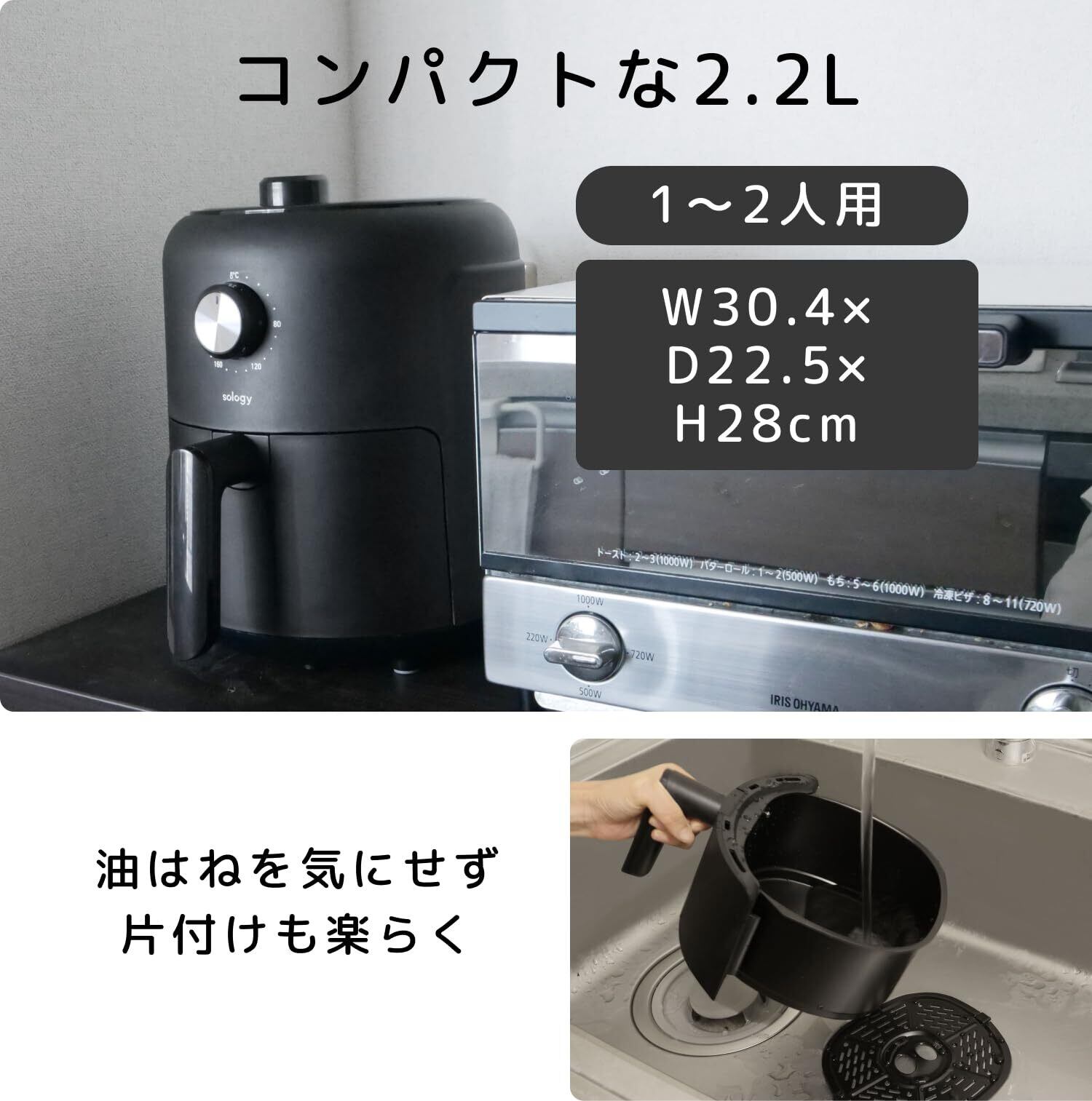 sology(ソロジー) エアフライヤー 2.2L ノンフライヤー 一人用 2人用 小型 オイルカット 揚げ物 フライヤー 専用レシピ付 ポテト 惣菜 ブラック 30日延長カード付