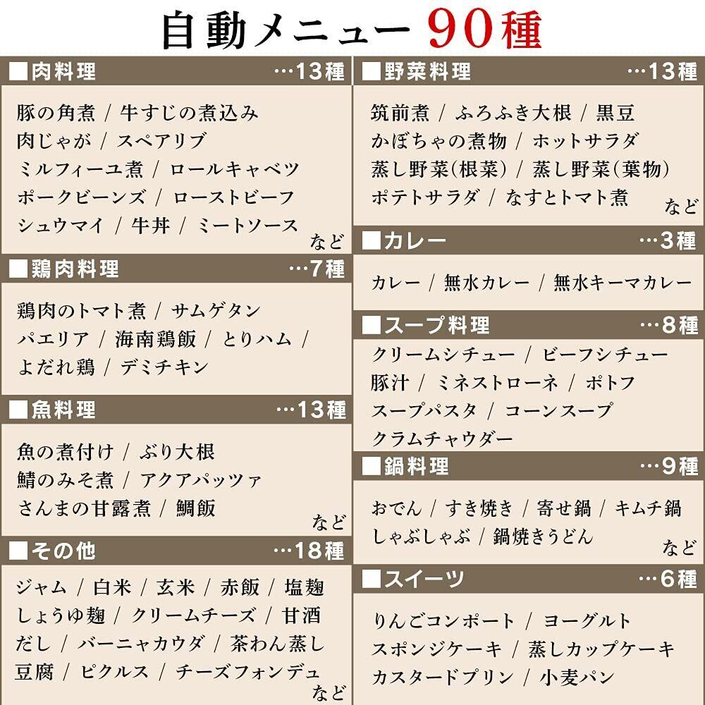 90種類の自動メニューが搭載されており、ボタン一つで美味しい料理が手軽に作れます。初心者でも簡単に安心して調理ができ、忙しい日常でも手間を省いてくれます。