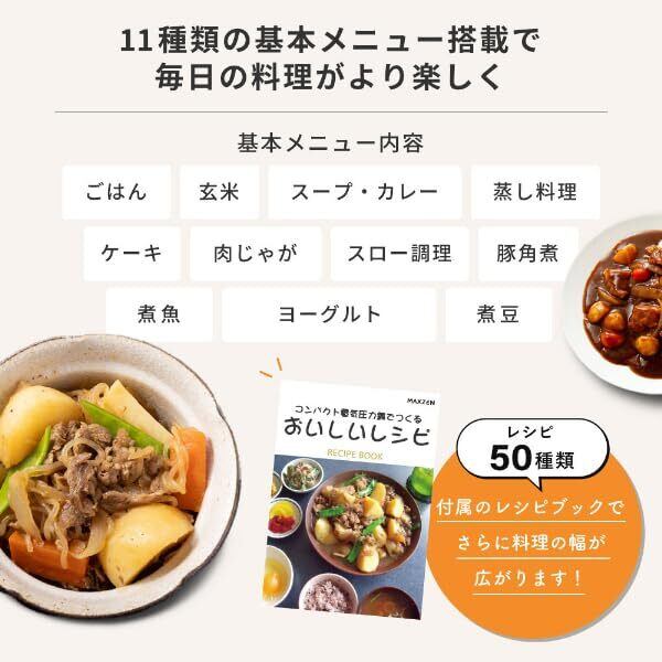 圧力調理だけでなく、蒸し料理や炊飯、さらにはヨーグルトやケーキの調理まで対応。毎日のメニューに変化をもたらし、家族全員が楽しめる料理を提供します。レシピブックも付属しており、新しい料理に挑戦する楽しさをサポートします!