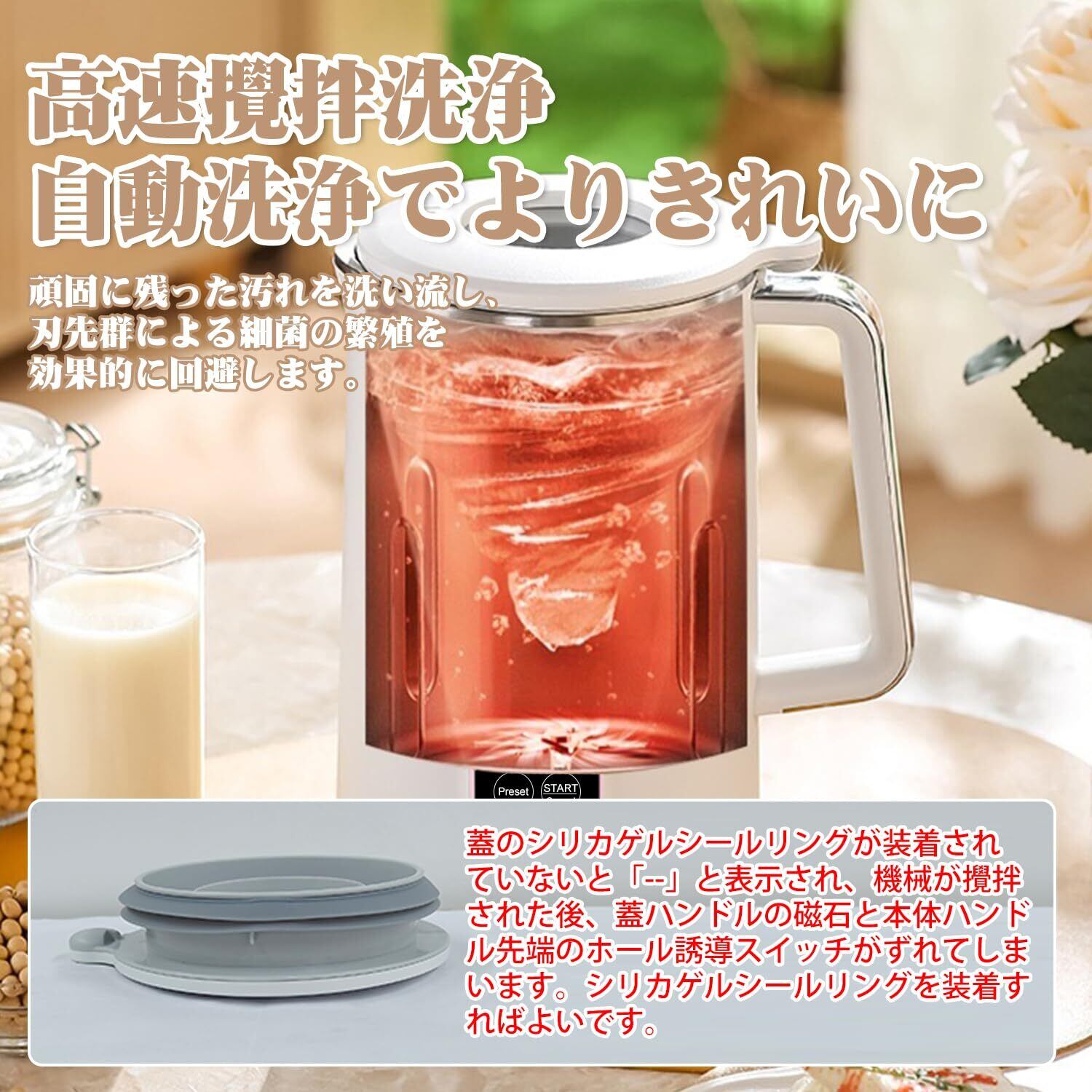 乾燥状態の大豆でもOK:優れい800W(加熱)と150W(攪拌)のハイパワーモーターと10枚の丈夫なステンレス刃で、乾燥大豆を簡単に砕け、初心者でも簡単に豆乳を作れます。蓋を開けると、自動的に電源が切られます。本体は絶縁体で、熱傷防 止に効 果的なデザインです