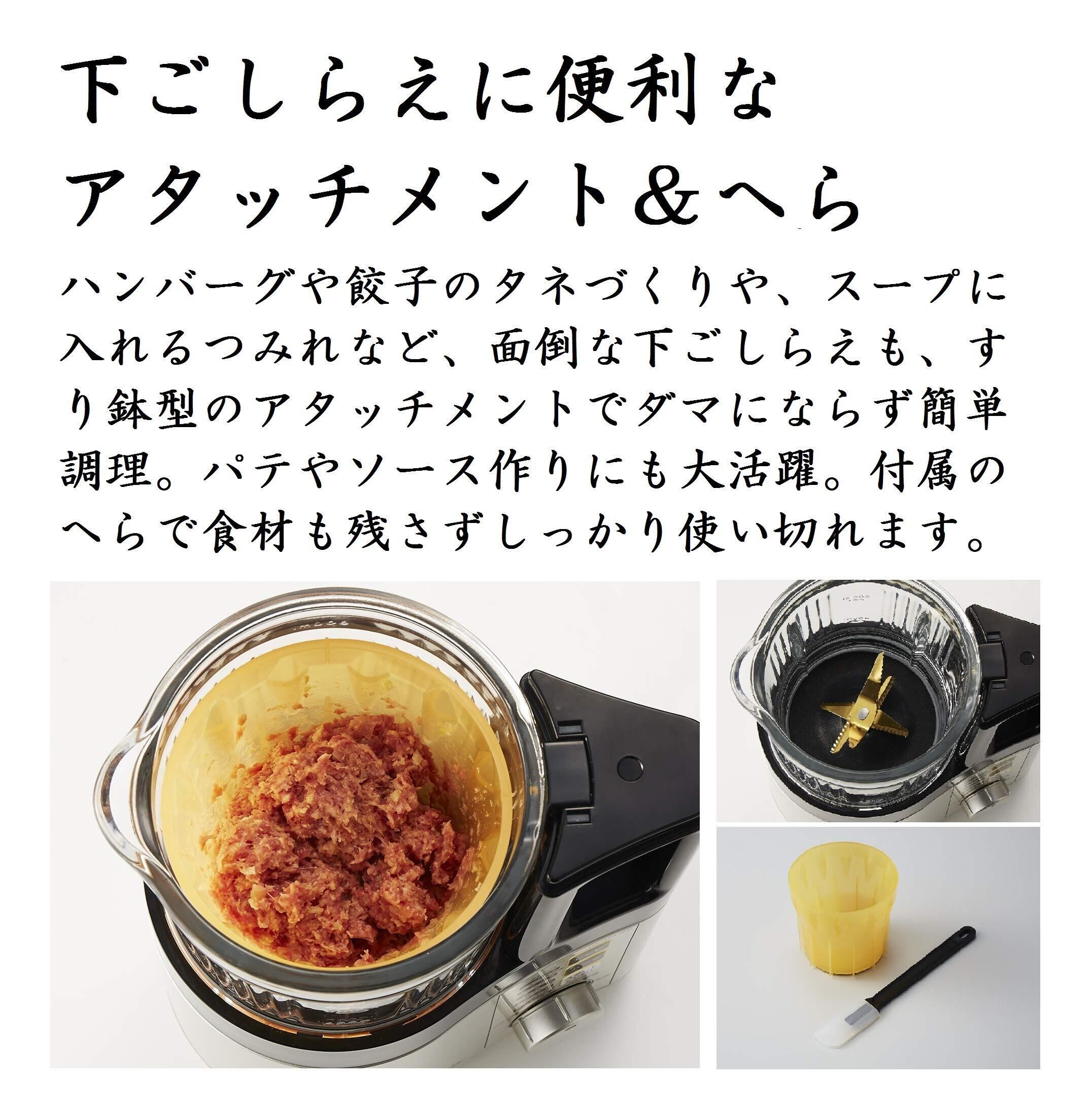 付属品:取扱説明書、レシピブック、書、容器締め付け台、ザル・ザルハンドル、下ごしらえ用アタッチメント・オーリング(製品購入時は、オーリングは下ごしらえ用アタッチメントに取り付けられています)、ヘラ
