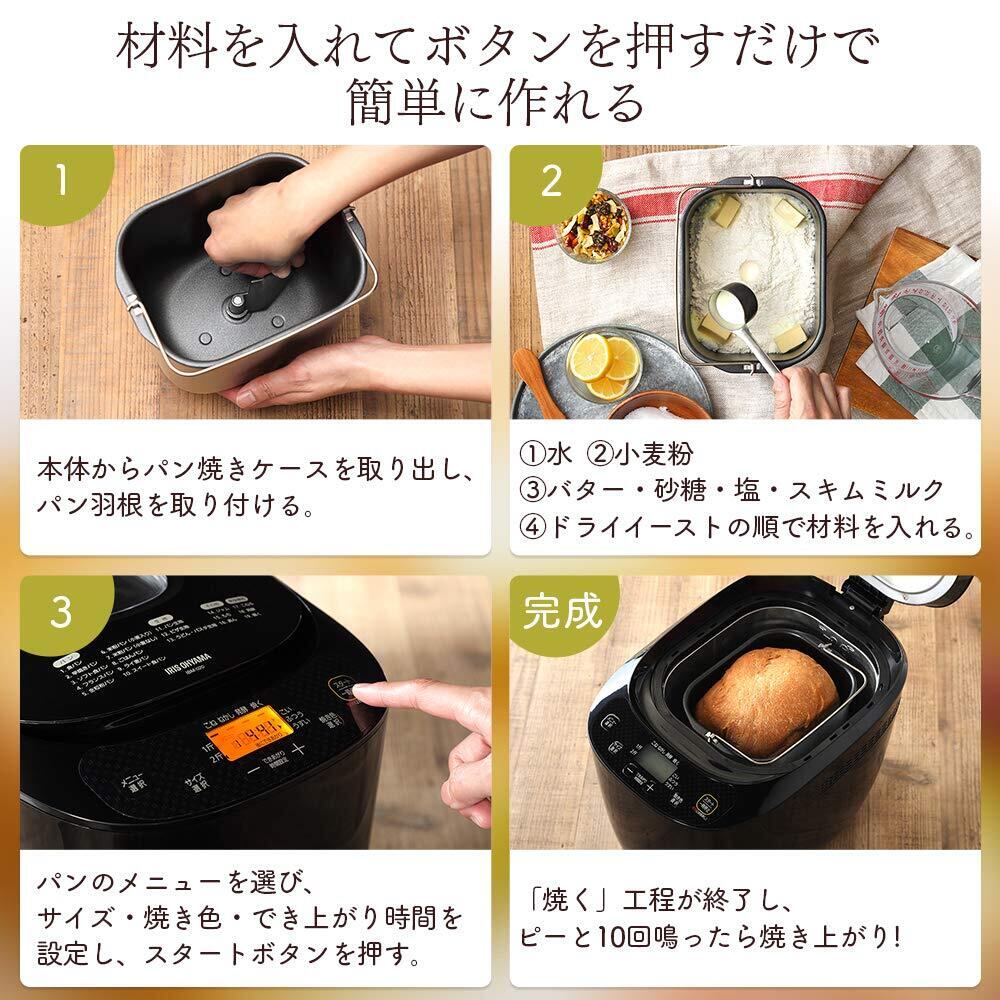 ◆[アイリスオーヤマ] ホームベーカリー | 【19種類のメニュー対応】 | 1斤・2斤対応 | レシピ付き | パン生地・うどん・パスタ・ライ麦・ジャム・米粉パン・ピザ・餅つき機能! ブラック IBM-020-B