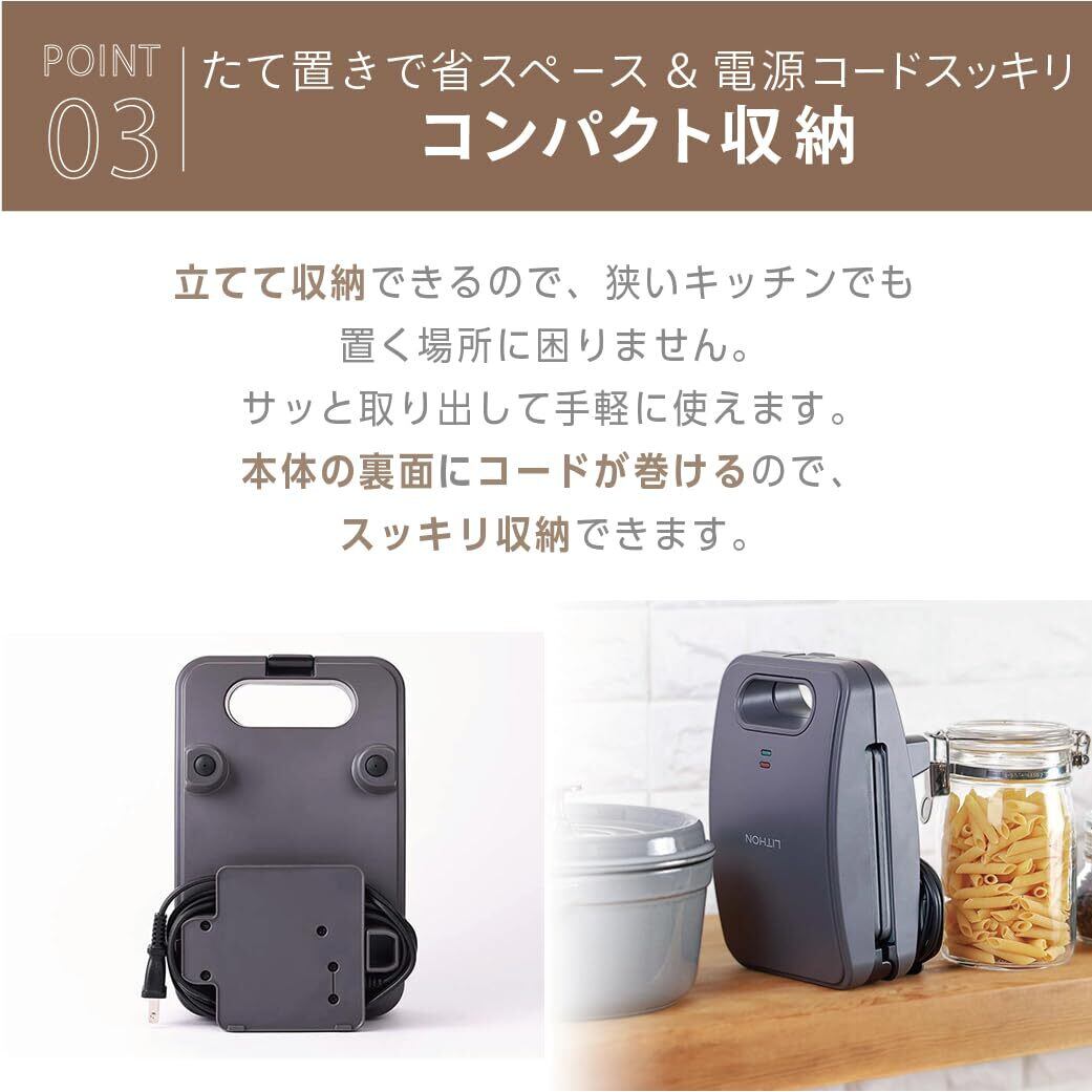 「LITHONのプレスサンドメイト」は、特許設計の耳付きホットサンドメーカーです。フッ素樹脂加工の着脱式プレートを使用し、耳までしっかり焼けることで、外はパリッと中はふんわりとした美味しいホットサンドを簡単に作ることができます。