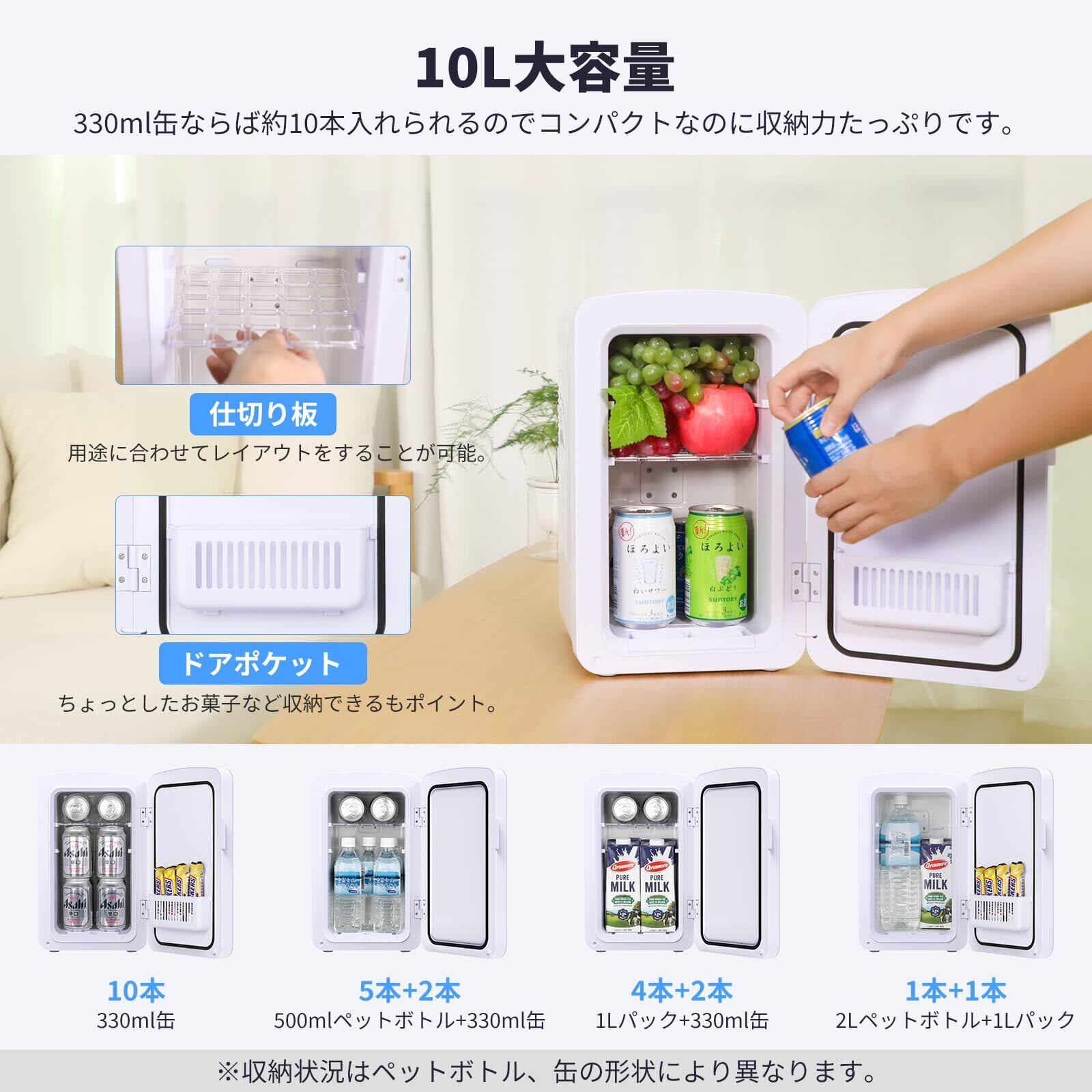 【コンパクトなのに容量たっぷり】10L収納力と350mlの缶ビールならば10本入ります。ドアポケットもあり、庫内には飲み物をメインにいれて、ドアポケットにはちょっとしたお菓子などを保管するのに便利です。効率よく庫内のスペースを使うために、庫内の仕切り板は取り外しも可能なので、入れたいモノの大きさによって自由にレイアウトを変えられます。庫内寸法:約31cmx16.5cmx16.5cm(高さx奥行きx長さ)