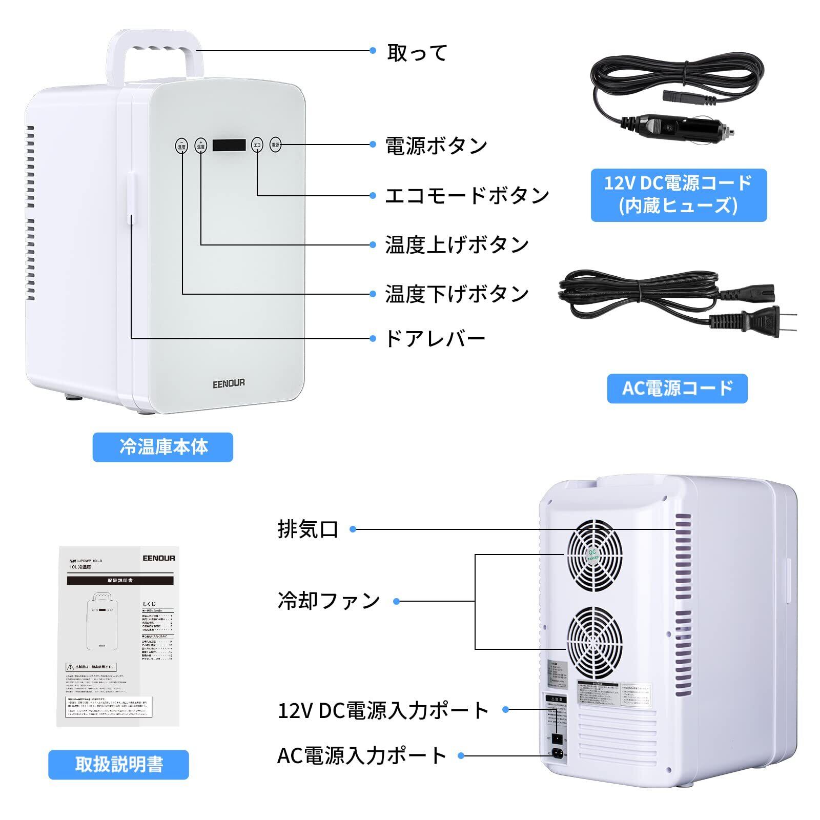 EENOUR 冷温庫 10L ECOモード ミニ冷蔵庫 小型 保温・保冷両用 「2025進級版」 -2℃~60℃ エコモード搭載 省エネ 高密度発泡ウレタン採用 ペルチェ式 静音 LCD温度表示 ポータブル AC/DC給電 電源コード付属 12V車対応 持ち運び便利 キャンプ アウトドア 家庭用