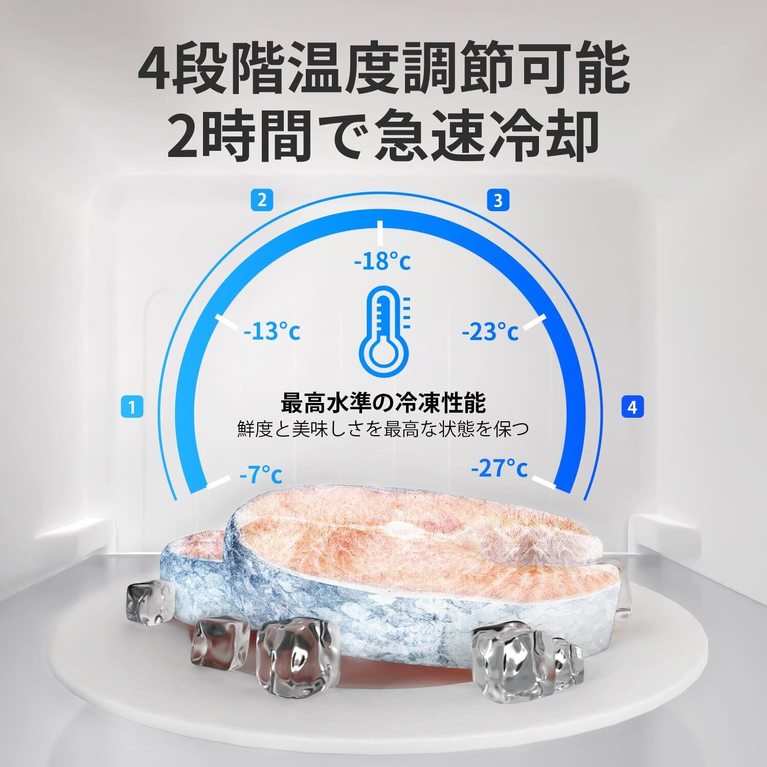 【4段階温度調整&急速冷凍】 4段階の温度調整が可能で、2時間で急速冷凍ができます。3D冷風循環システムを搭載し、庫内全体を均一に冷却。肉や魚などの細胞破壊を防ぎ、風味や栄養素の損失を最小限に抑えます。冷凍後も鮮やかな色合いと美味しさを保つ優れた性能を提供します。