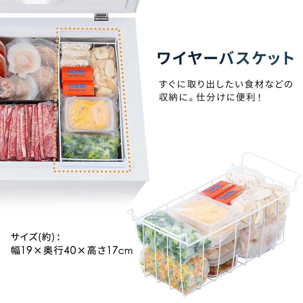 上開き型の冷凍庫は、冷気が下にたまりやすく、扉の開閉時に庫内の温度変化が少ないため、食材の鮮度をキープします。大きな食材も増やせる設計で、収納が効率的に行えます。