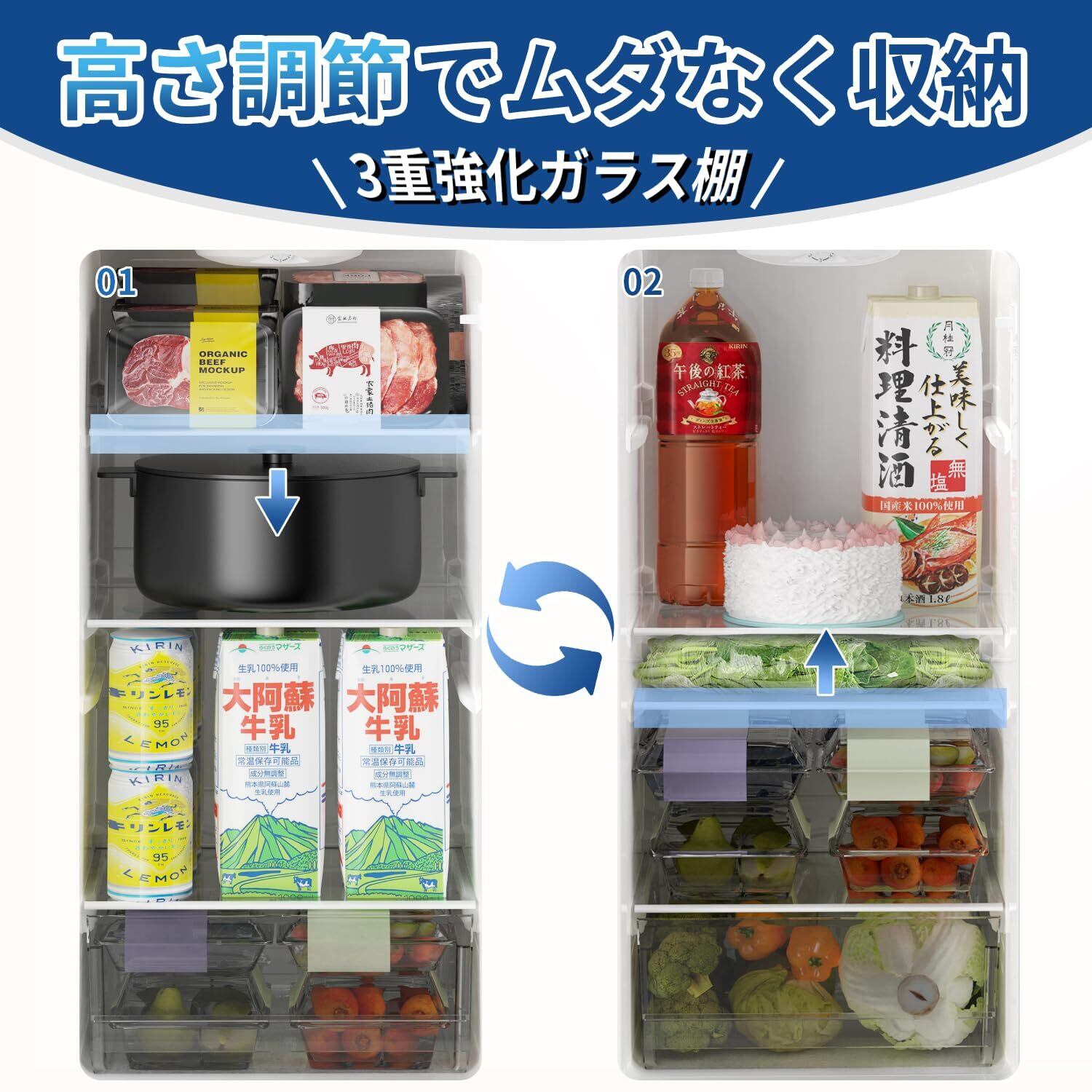 【165Lの大容量収納】総容量165L(冷蔵室114L/冷凍室51L)で、ふたり暮らしや小家族にぴったりなサイズで、2~3人分の食材を余裕を持って収納可能。 ●可動式のガラス棚やケース、ドアポケットを備え、庫内を効率よく整理できます。 ●透明で二段引き出し式の冷凍室は、中身が見やすく、使い勝手も抜群。食材の管理がラクになり、毎日の料理がより快適になります。