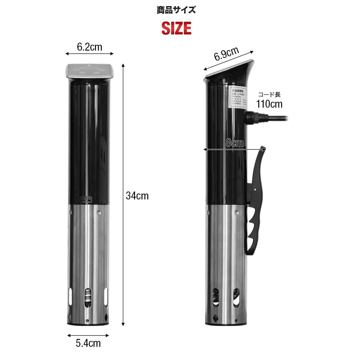 【商品詳細】 サイズ: (約)幅6.2cm×奥行8cm×高さ34cm 重量: (約)750g 材質: ステンレス、ポリカーボネート コード長: 110cm 防水等級: IPX7 最大使用水量: 15L 定格電圧: AC100V 定格周波数: 50/60Hz 定格消費電力: 1100W 設定可能温度: 25.0~90.0℃(0.1℃単位) 設定可能時間: 1分~99時間59分(1分単位) 付属品: 取扱説明書 特記事項: ※深さが15cm以上の鍋を使用し、水は5Lから15Lをご使用ください。 PSマークの種類:PSE 届出事業者名:株式会社コンポジット