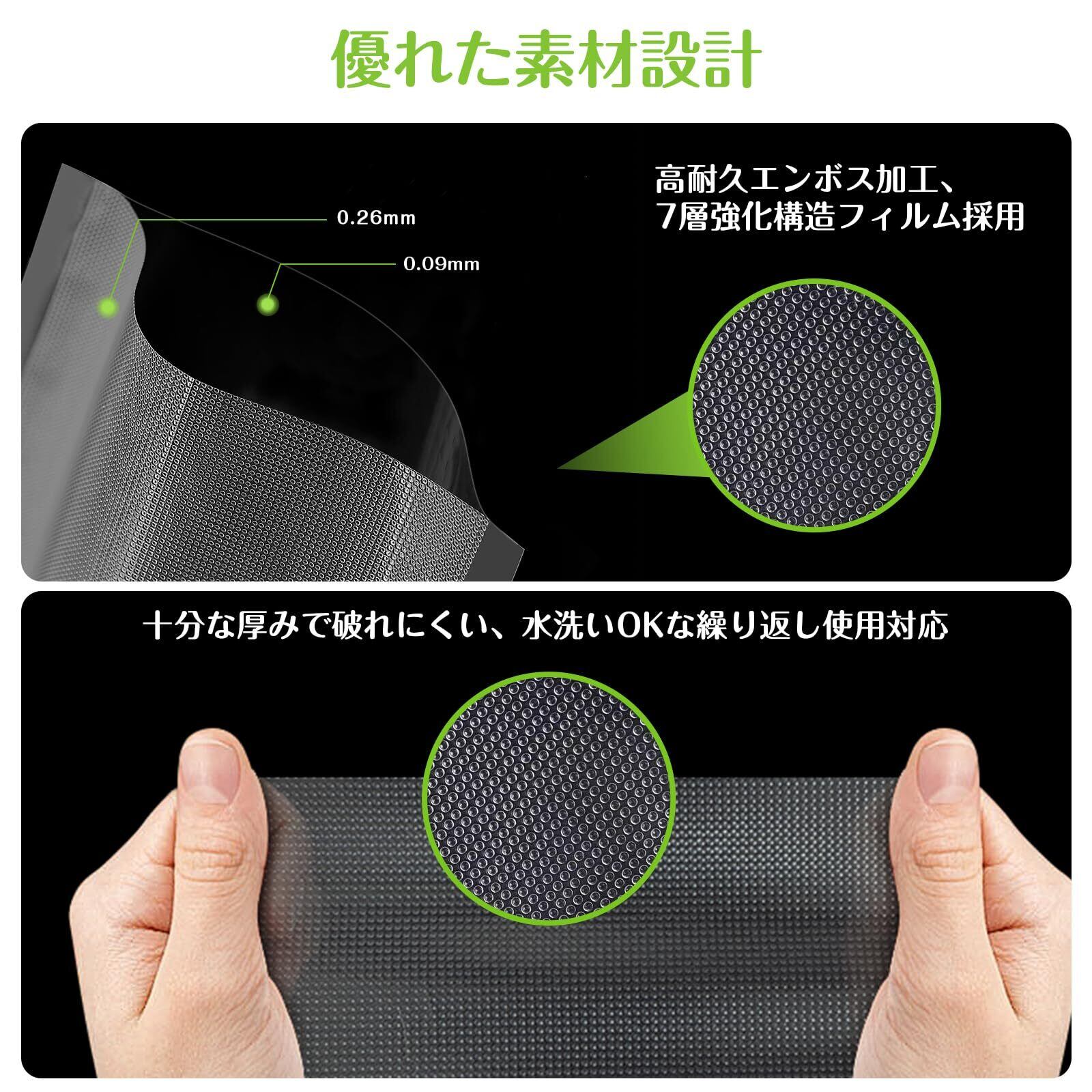 【高性能エンボス加工】 片面(厚さ0.09mm)は滑らかで透明、もう片面(厚さ0.26mm)にはエンボス加工を施しております。これにより空気抜けが良く、各種プロ用真空パック機の高い吸引力を最大限に発揮させていただけます。※プロ仕様の真空パック機のご使用を強くお願い申し上げます。一部の機種には対応しておりませんので、ご了承くださいませ。