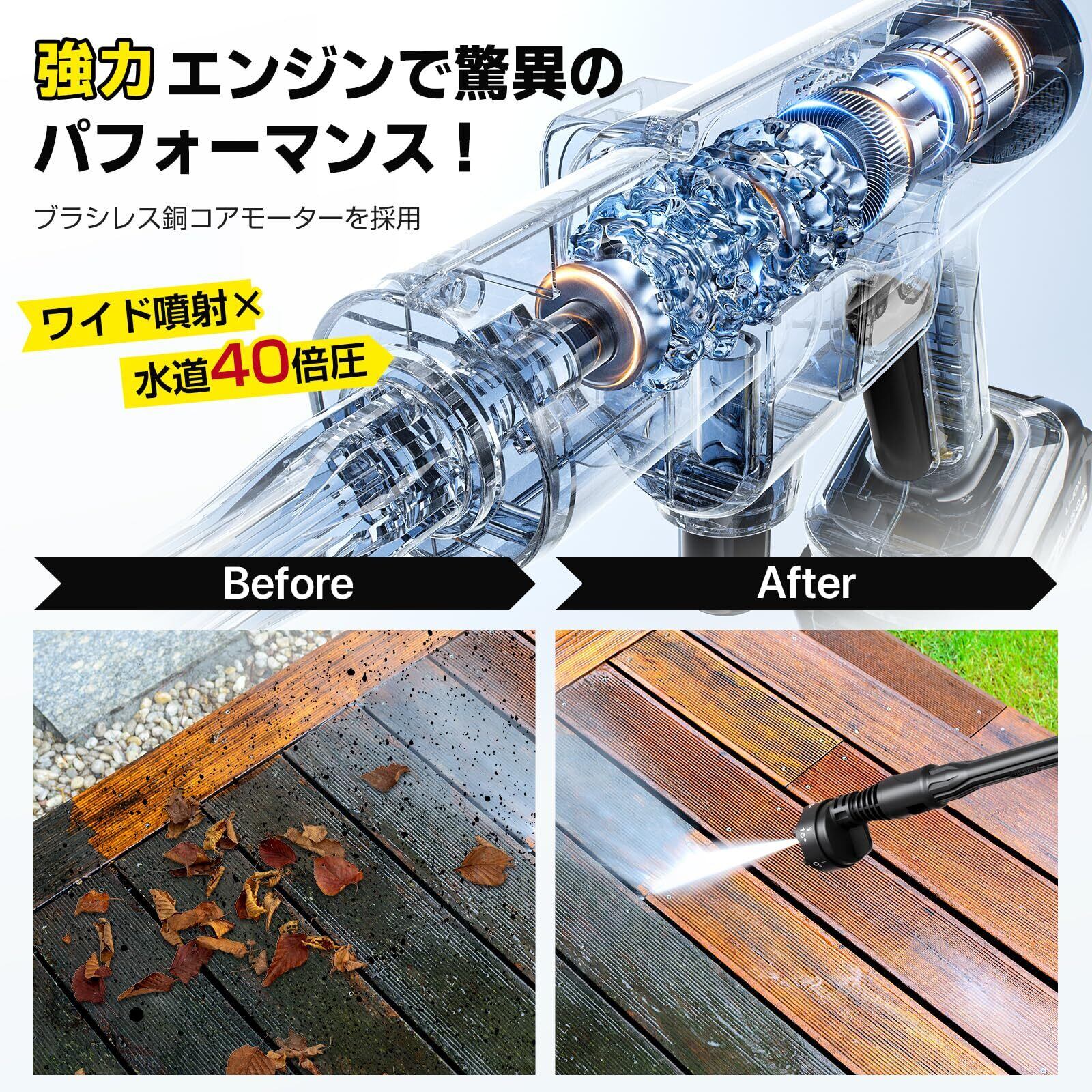 【洗車や大掃除に便利&調節可能】高圧洗浄機は高圧ポンプと高効率の750W純銅ブラシレスモーターを搭載し、水道水の40倍の圧力まで安定した強力な水圧を提供し、高圧噴射による頑固な汚れを簡単に除去します。他社製品に比べ、洗浄機は圧力が20%高いため、洗車時間が10分以上短縮され、効率的な洗浄が可能です。高圧洗浄機は一目でわかるディスプレイ画面搭載、画面の表示により、モード調整や電池残電確認ができます。ハイパワーが実現され、しかも省エネ!低騒音デザインの高圧洗浄機で、水圧を調節できる家庭用モデルなので洗車だけじゃなくさまざまな汚れをラクに掃除!2段階水压モードがあり、射程は最大10メートル、強力な水圧によって、長年蓄積したガンコな汚れを落とすことにもできます。 弾力性があるので洗浄作業中も楽々給水ホースに専用フィルターを利用し、ゴミなど不純物の混入を防ぎます。